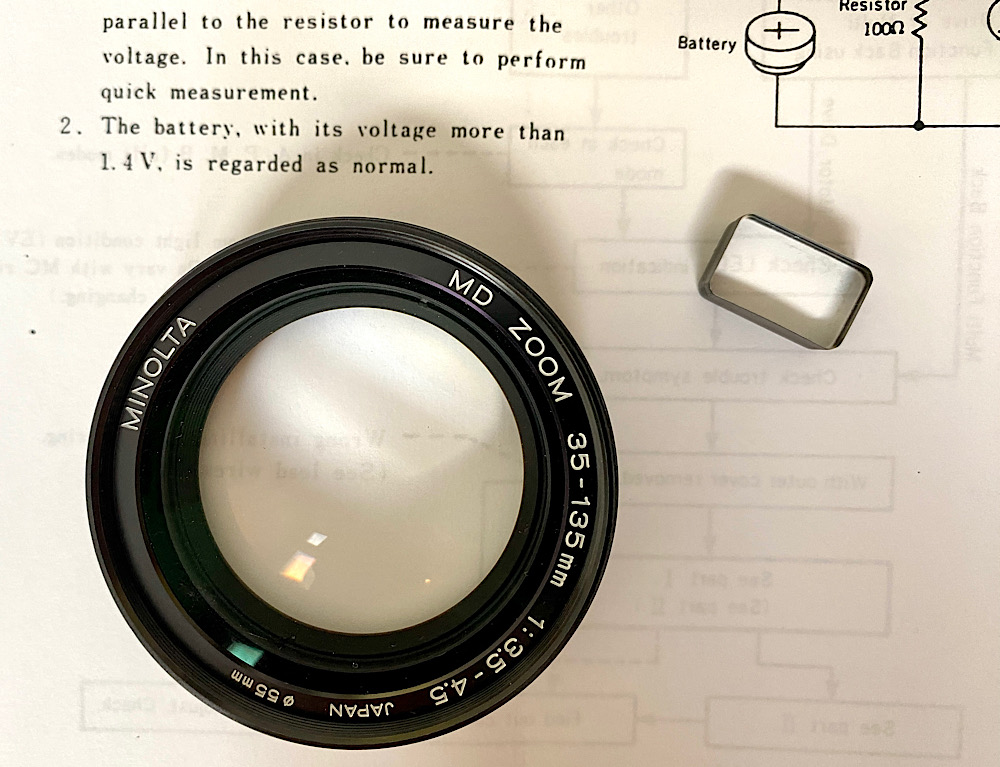 Der ausgebaute kleine Spiegel in der Optik zur Blendeneinspiegelung in den Sucher (ADR) meiner aufgegebenen X-700.