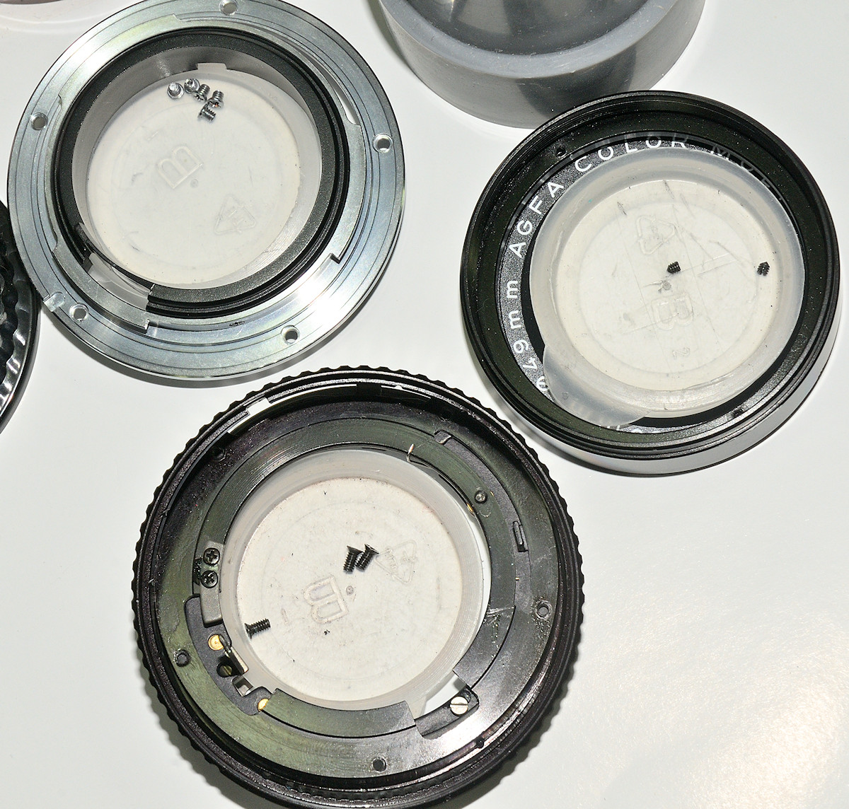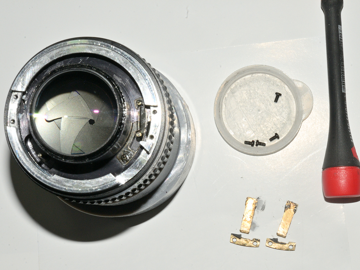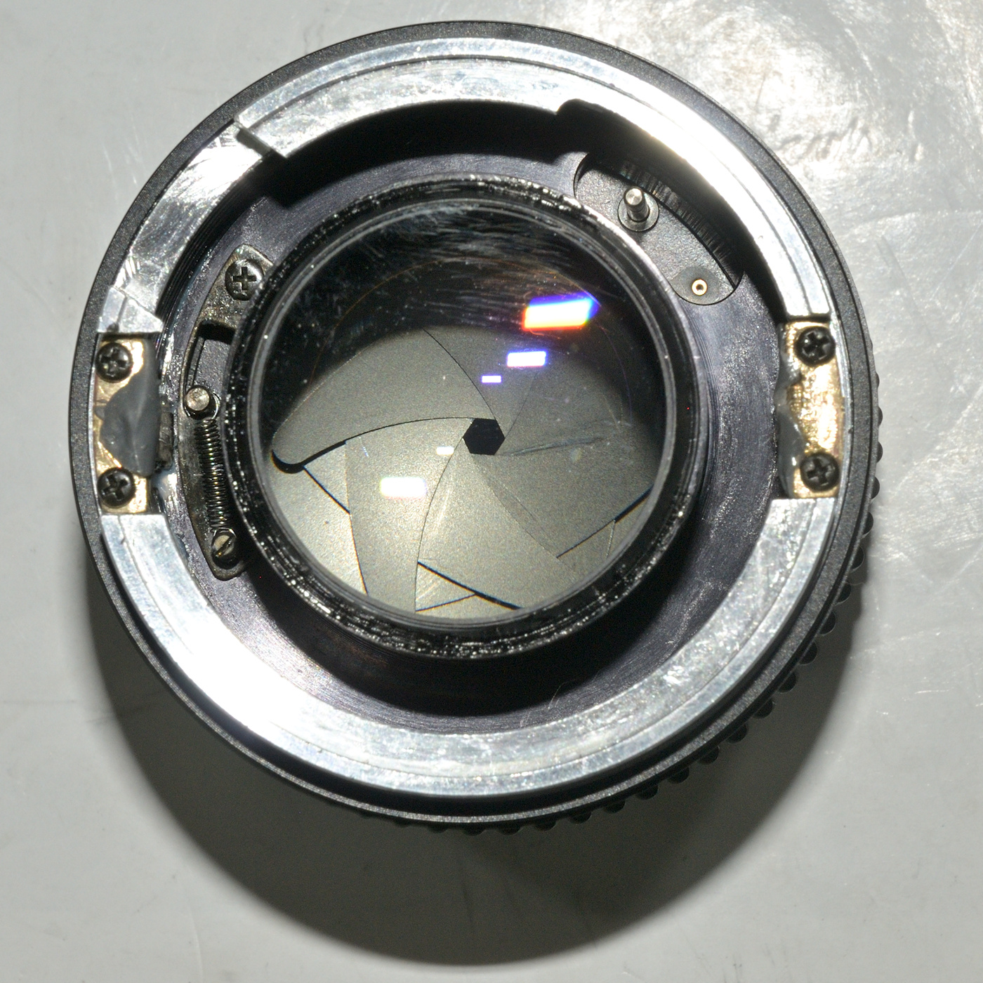 Das Objektiv von hinten ohne Bajonett und Blendenmechanik, man sieht die geflickten Geradführungsschienen: