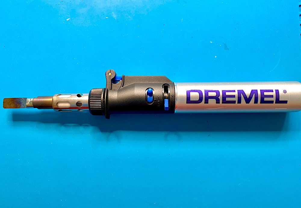 Der Dremel Versatip, ein Butangas-Brenner, mit aufgesetztem Heißmesser.