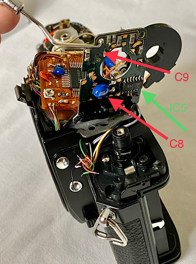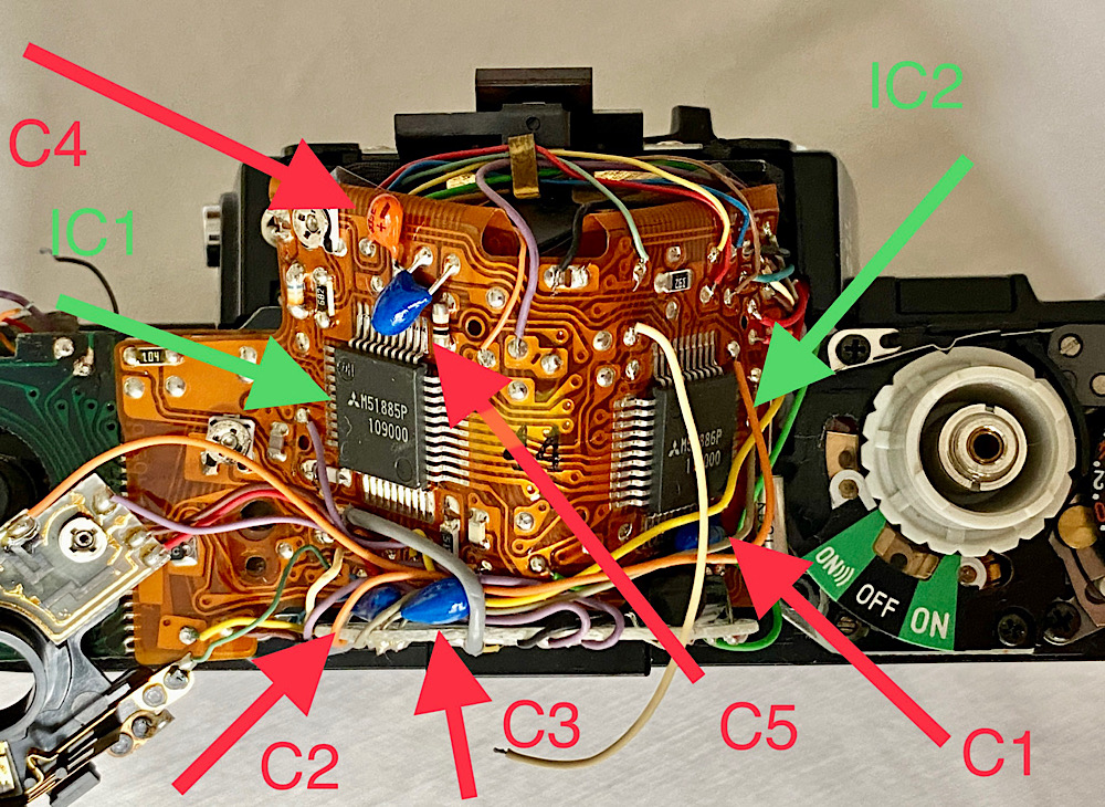 „Minolta X-700: LED- und Auslöseproblem, Kondensator- und IC-Positionen“