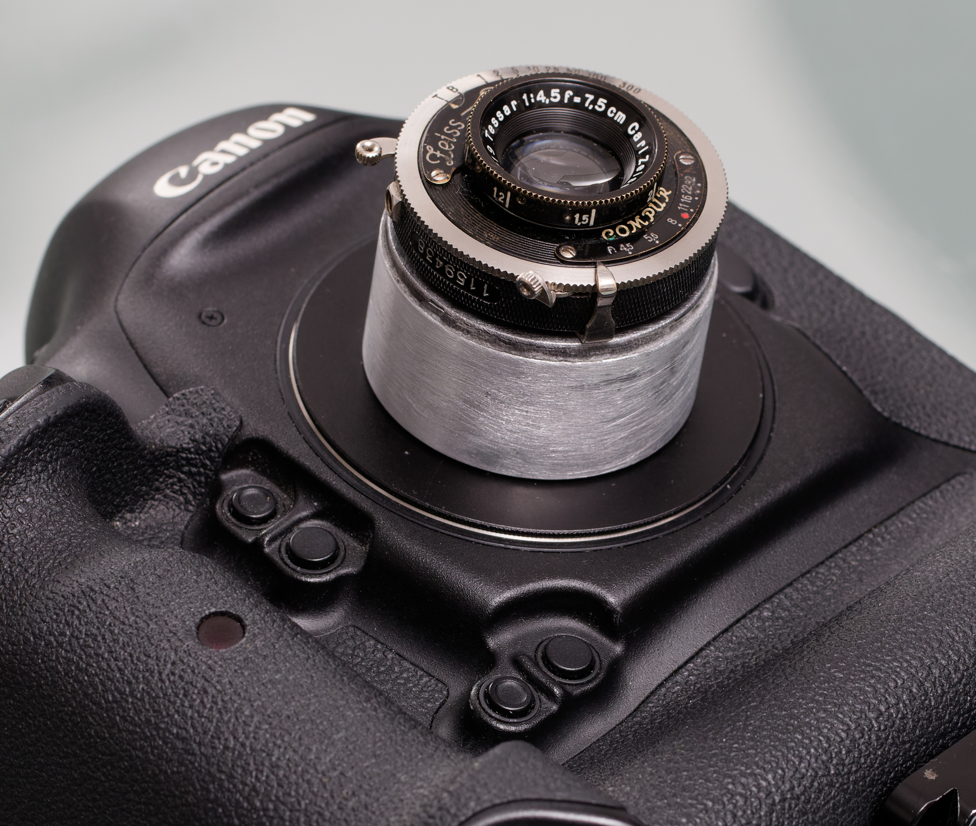 ich habe das Carl Zeiss Tessar 4.5/75 (1932) von einer Kamera abgeschraubt und mit Hilfe eines