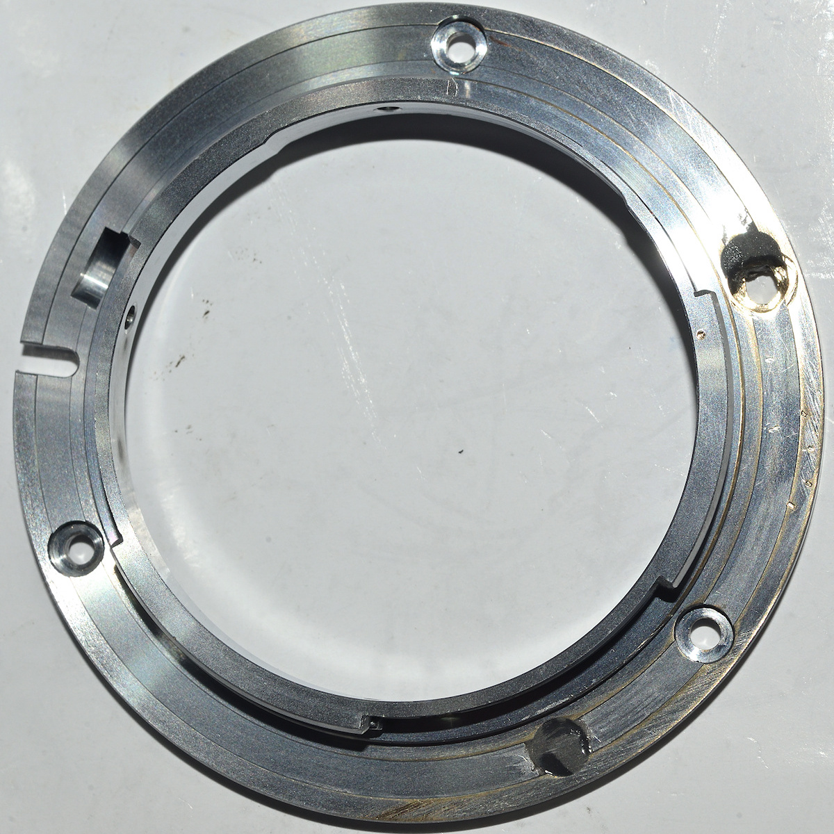 So habe ich das Bajonett eines Nikon AF-Objektivs mit passenden Schraublöchern versehen und die überflüssigen Löcher mit JB-Weld geschlossen.