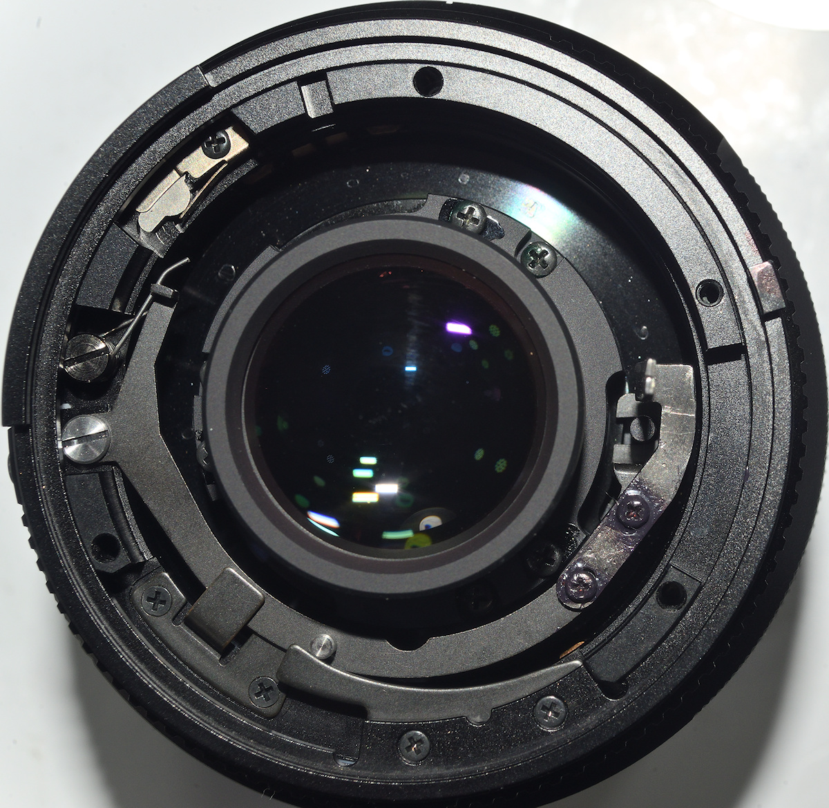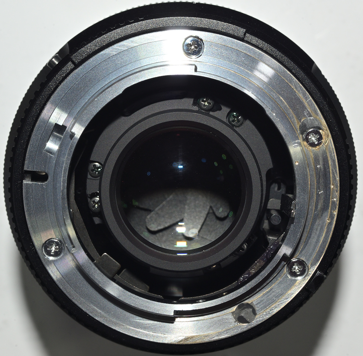 Aus einem anderen Nikon F Objektiv habe ich dann einen Blendenhebel ausgebaut, zurechtgebogen und schmäler gefeilt, und dann in die dafür vorgesehenen zwei Schraublöcher der inneren Blendensteuerung geschraubt.