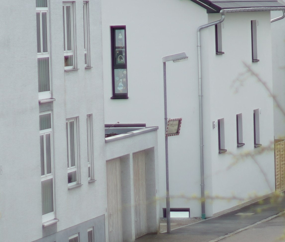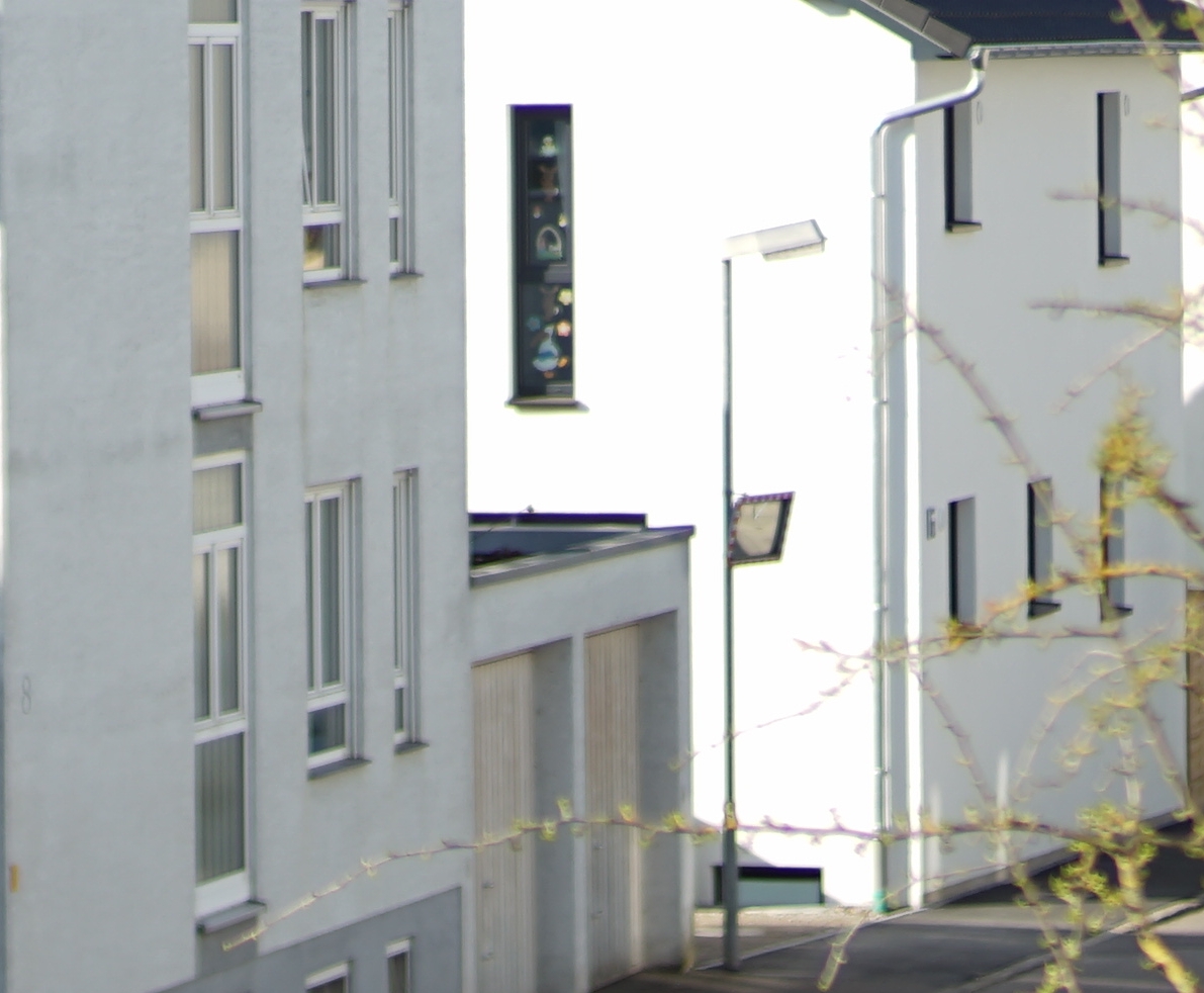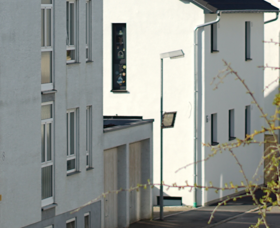 Ich beginne mal mit der weiten Distanz. Heute Morgen schien die Sonne, so dass sich harte Kontraste ergeben haben. Die andere Straßenseite hatte deutlich weniger Kontraste und war entsprechend uninteressant.