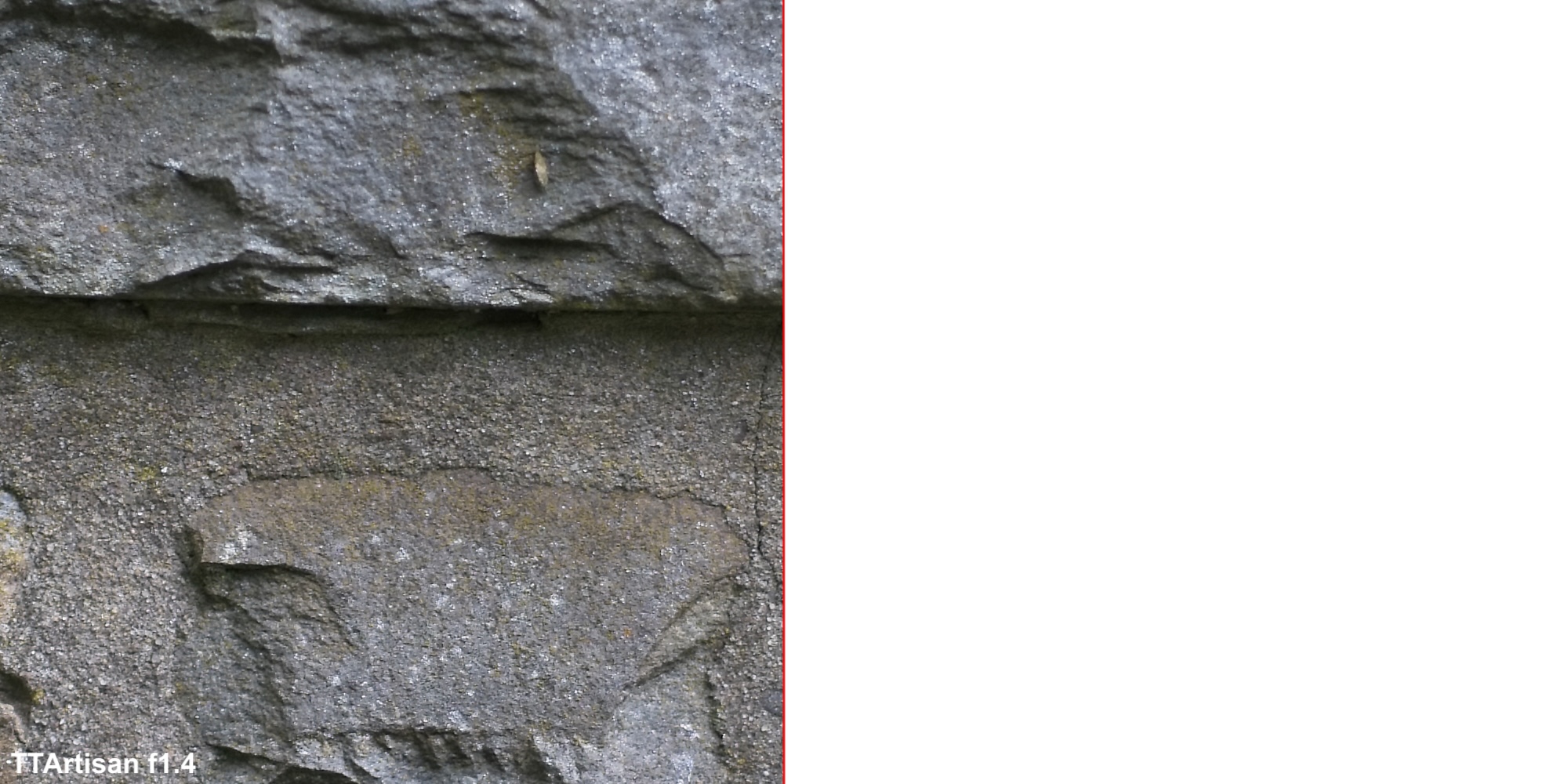 Das TTArtisan zeigt bei Offenblende eine heftige Vignette und eine leichte Verzerrung, beides aber leicht korrigierbar. In der Bildmitte ist die Schärfe nicht atemberaubend, aber doch schon ziemlich gut, sodass man sie mit ein bisschen EBV knackig bekommt; in der Ecke ist die Unschärfe sichtbarer, aber immer noch vergleichsweise moderat.