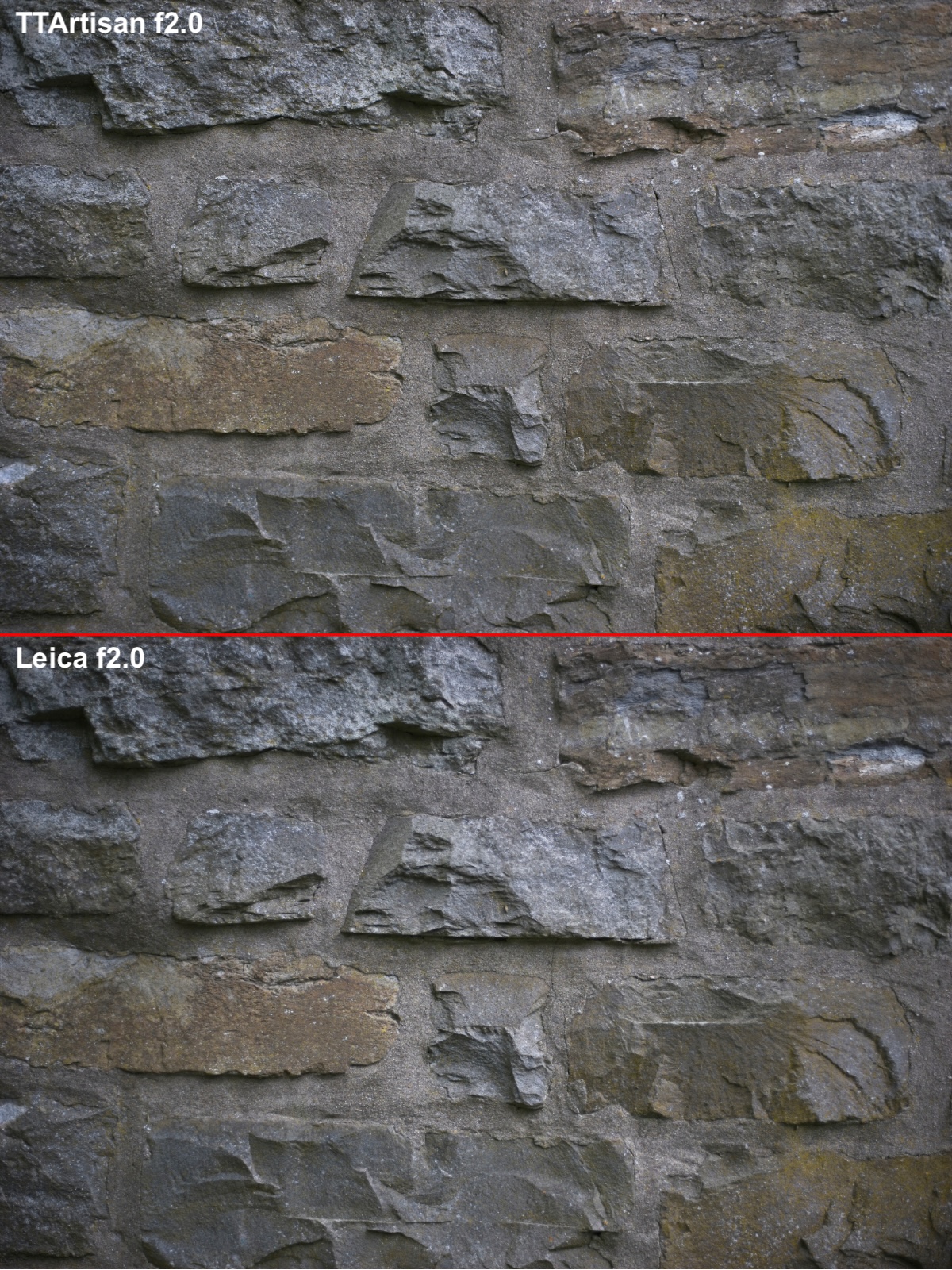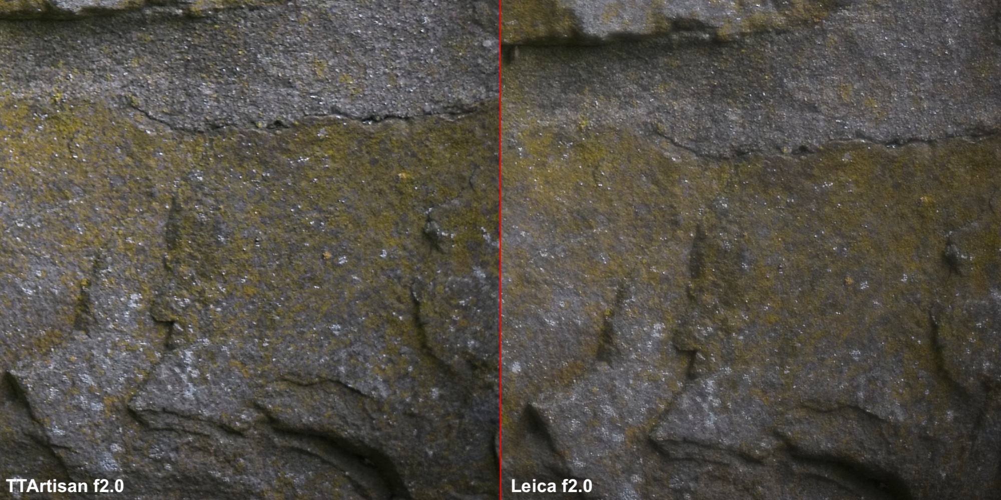 Bei Blende 2 lässt die Vignette am TTArtisan deutlich nach; Schärfe und Kontrast in der Bildmitte sind nun sehr gut, und auch die Eckenschärfe legt zu. Das Leica hat bei Offenblende ebenfalls eine sichtbare Vignette; die Zentrumsschärfe ist gut, wenn auch mit leichtem Schleier, in der Ecke ist es aber ziemlich milchig. Auffallend ist auch, dass der Bildwinkel beim Leica etwas kleiner ist.