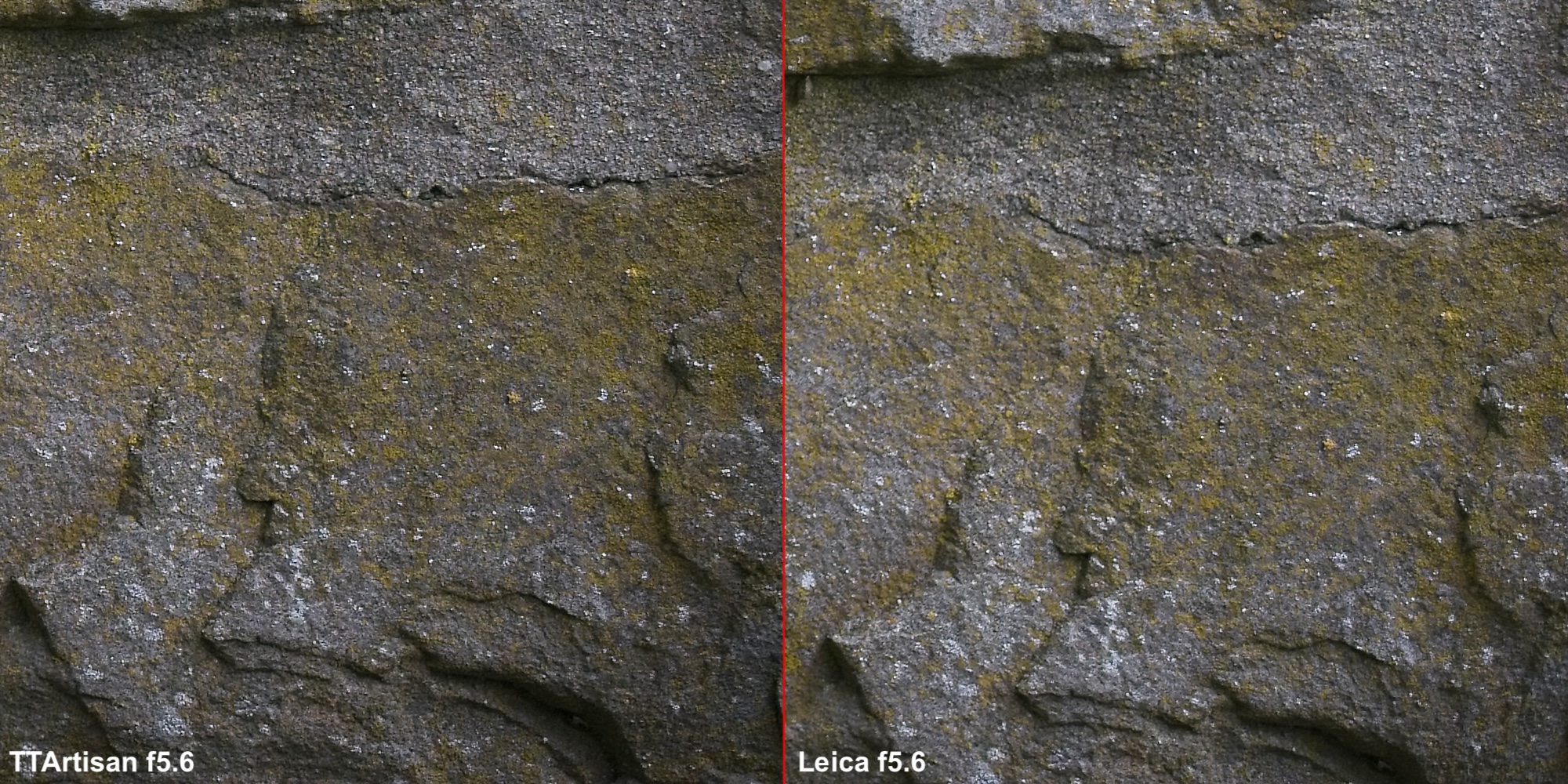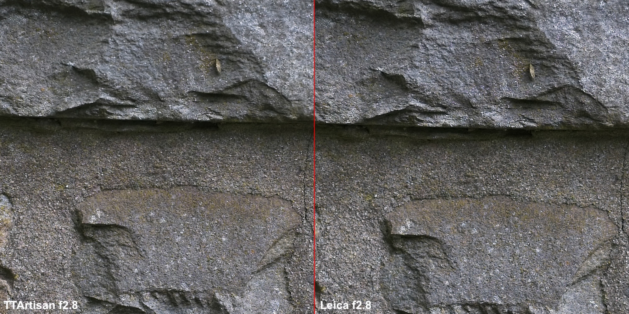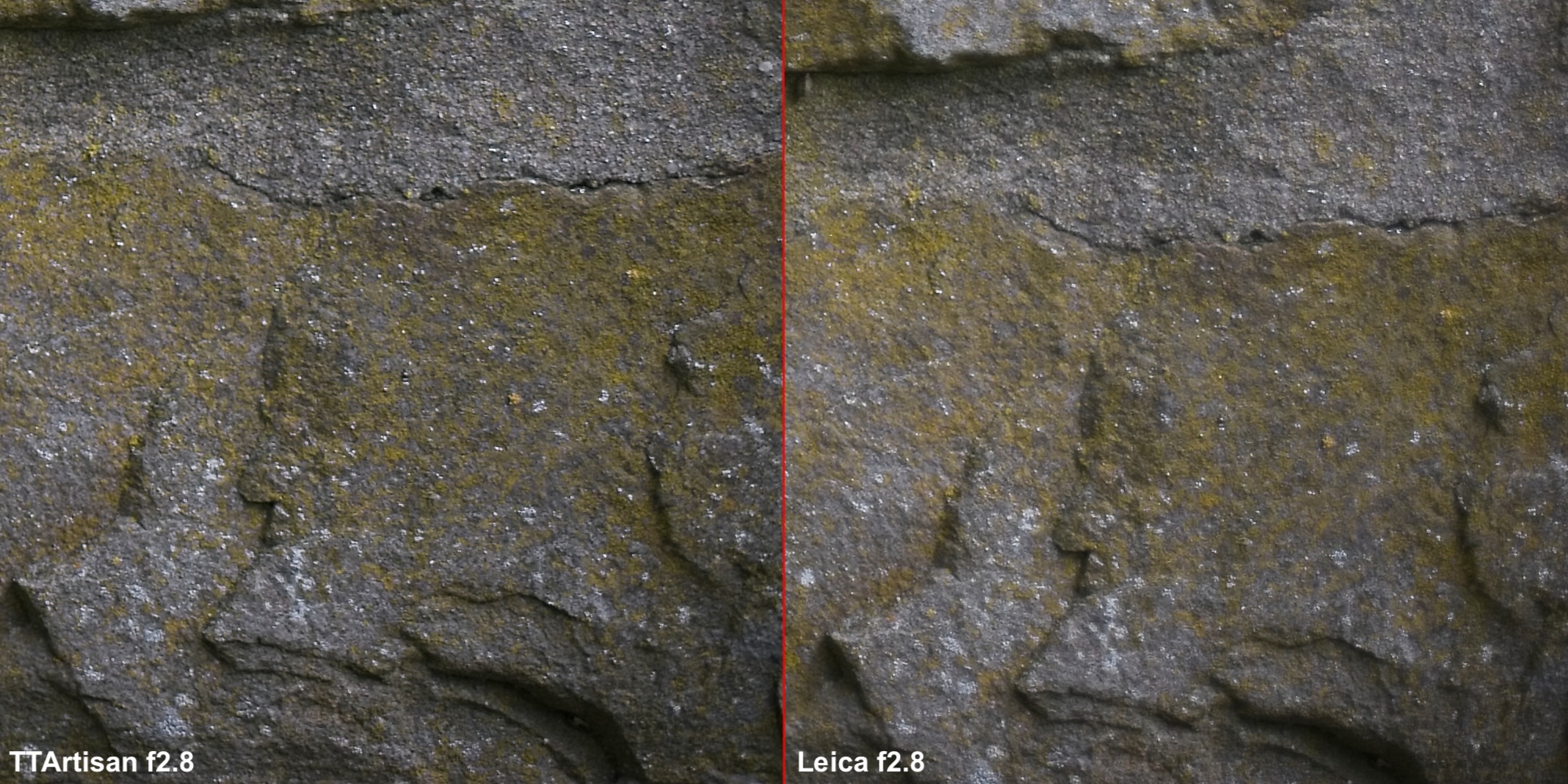 Bei Blende 2.8 ändert sich das Bild. Beide Objektive sind sehr scharf in der Mitte, aber das Leica überholt leicht. In der Ecke ist wiederum das TTArtisan richtig gut, während das Leica etwas weich bleibt. Insgesamt wirkt das Leica minimal kontrastreicher.