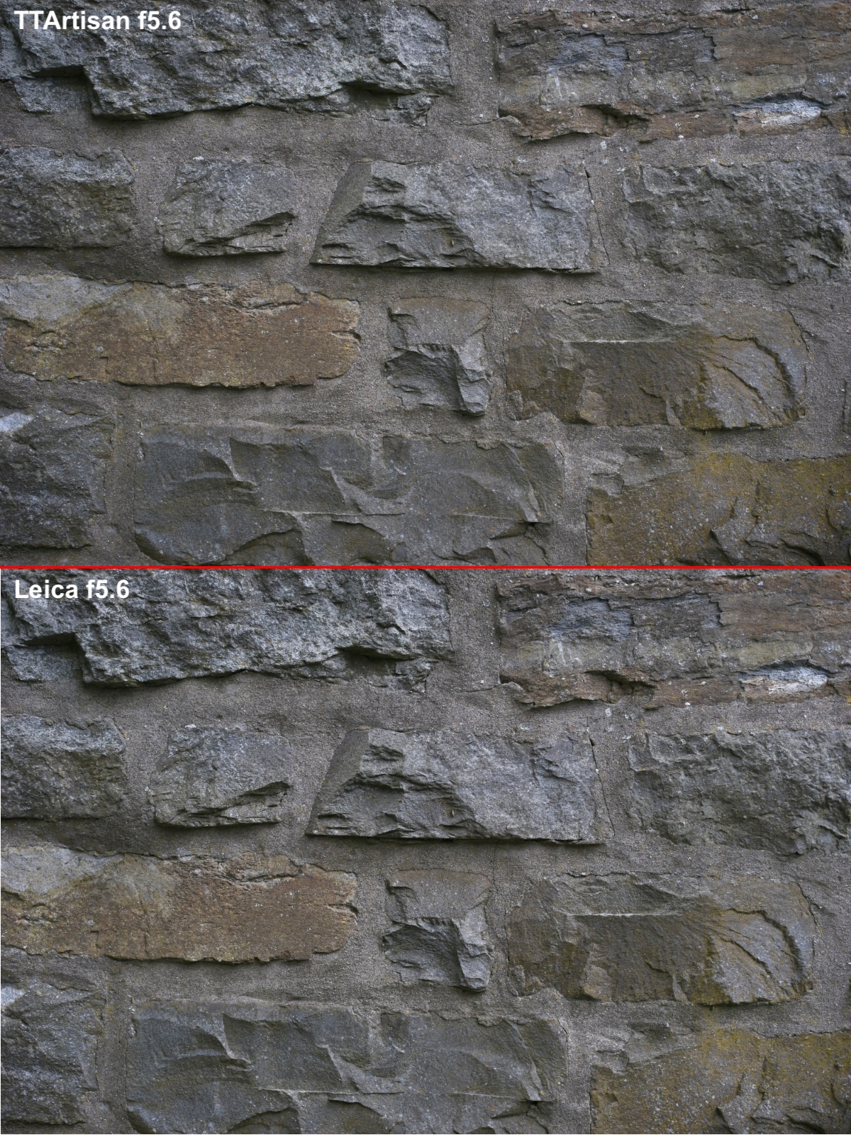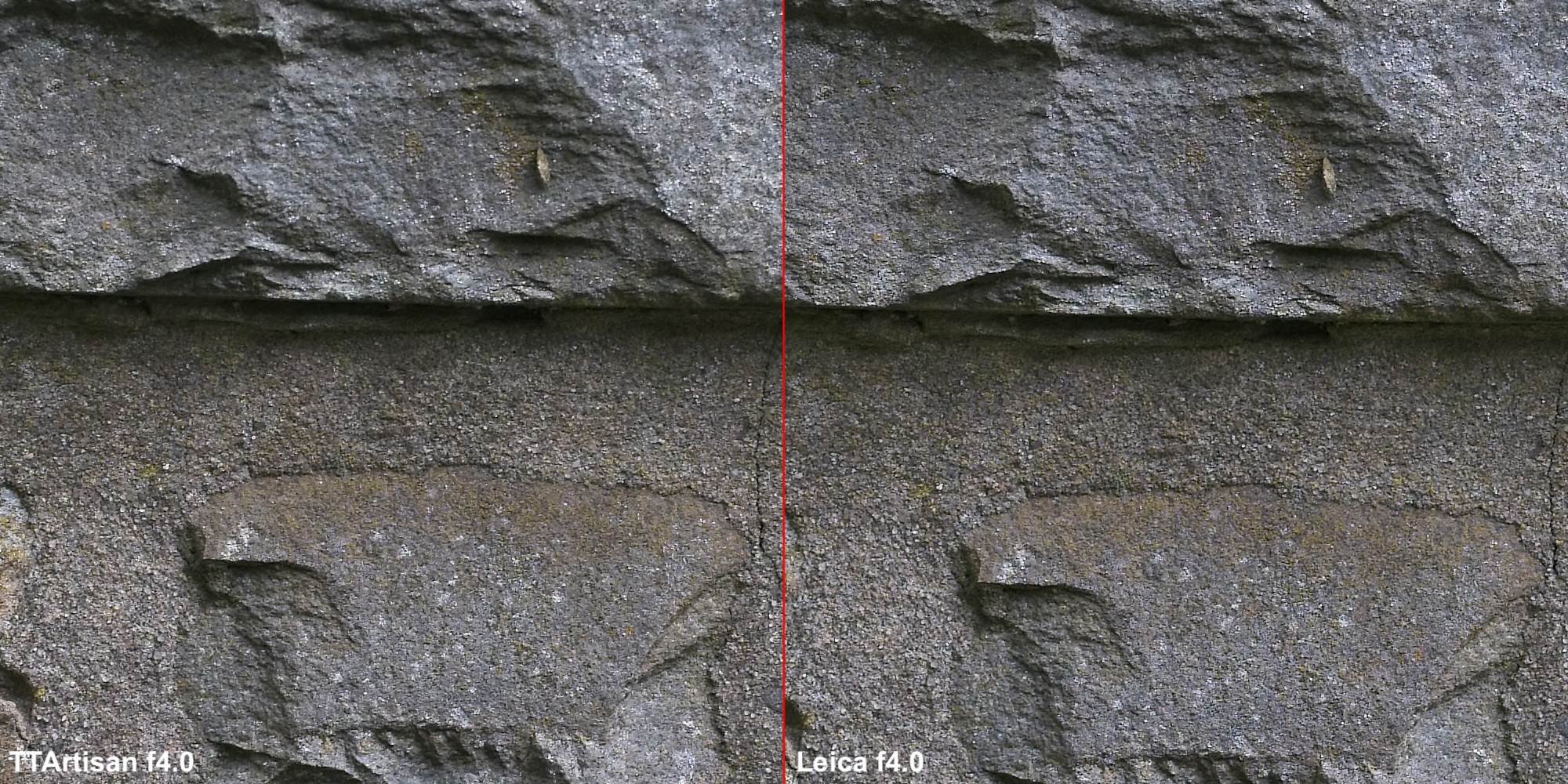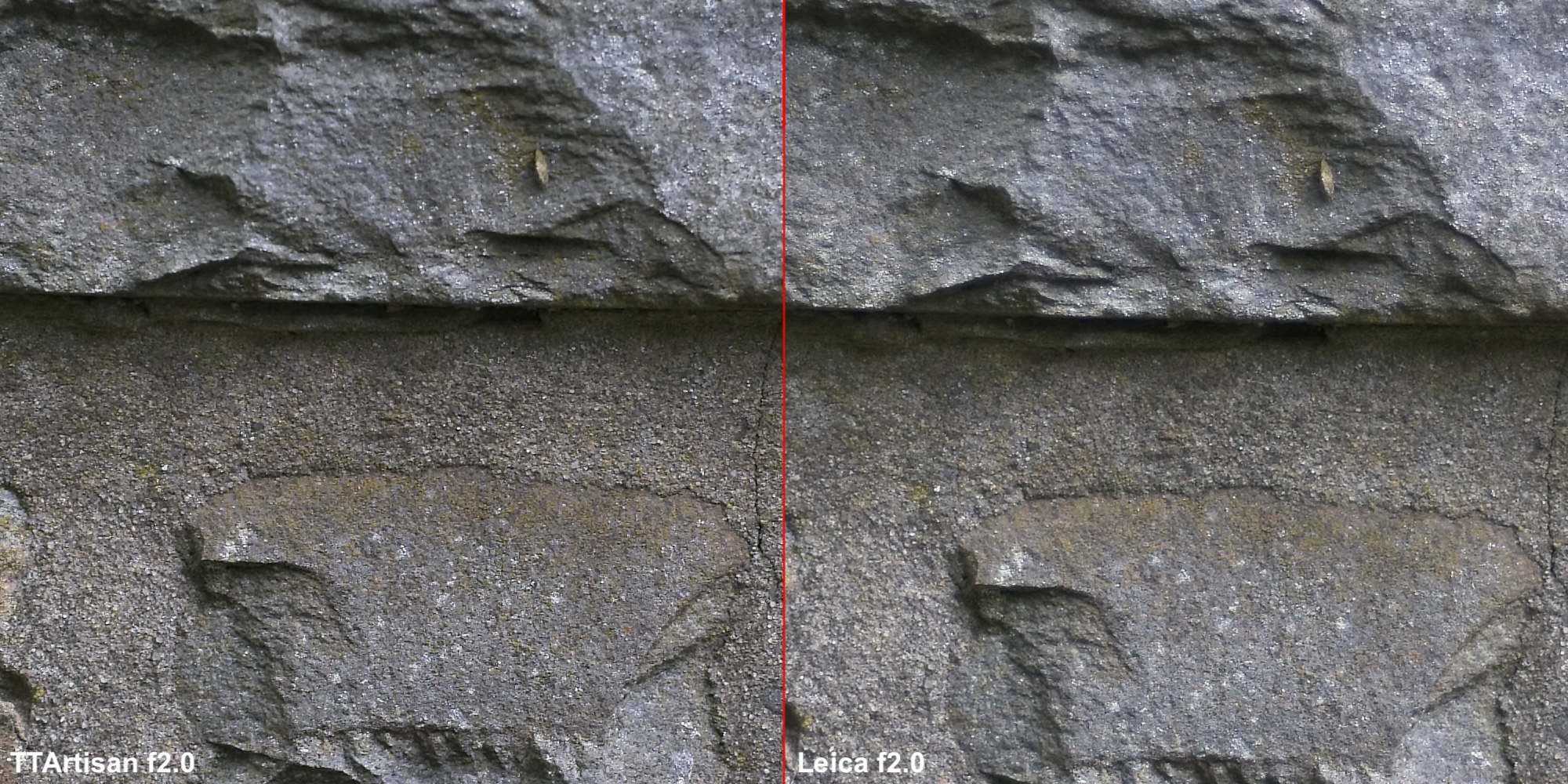 Bei Blende 2.8 ändert sich das Bild. Beide Objektive sind sehr scharf in der Mitte, aber das Leica überholt leicht. In der Ecke ist wiederum das TTArtisan richtig gut, während das Leica etwas weich bleibt. Insgesamt wirkt das Leica minimal kontrastreicher.