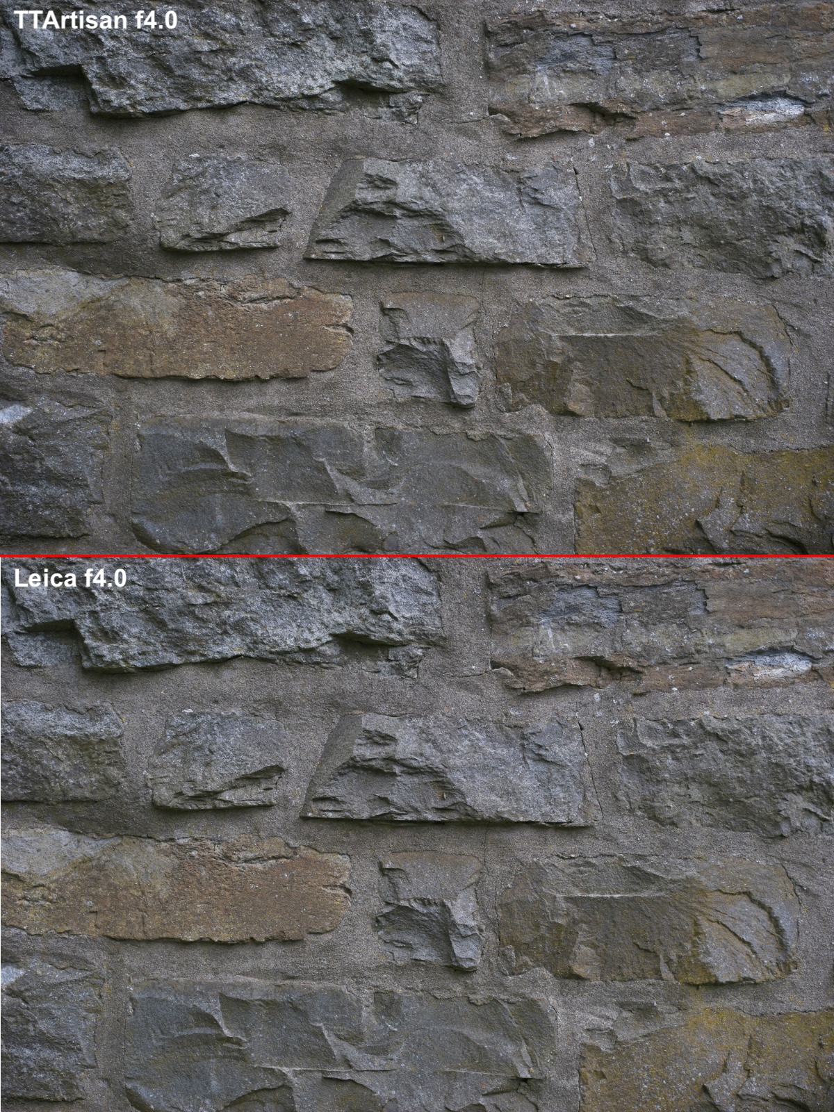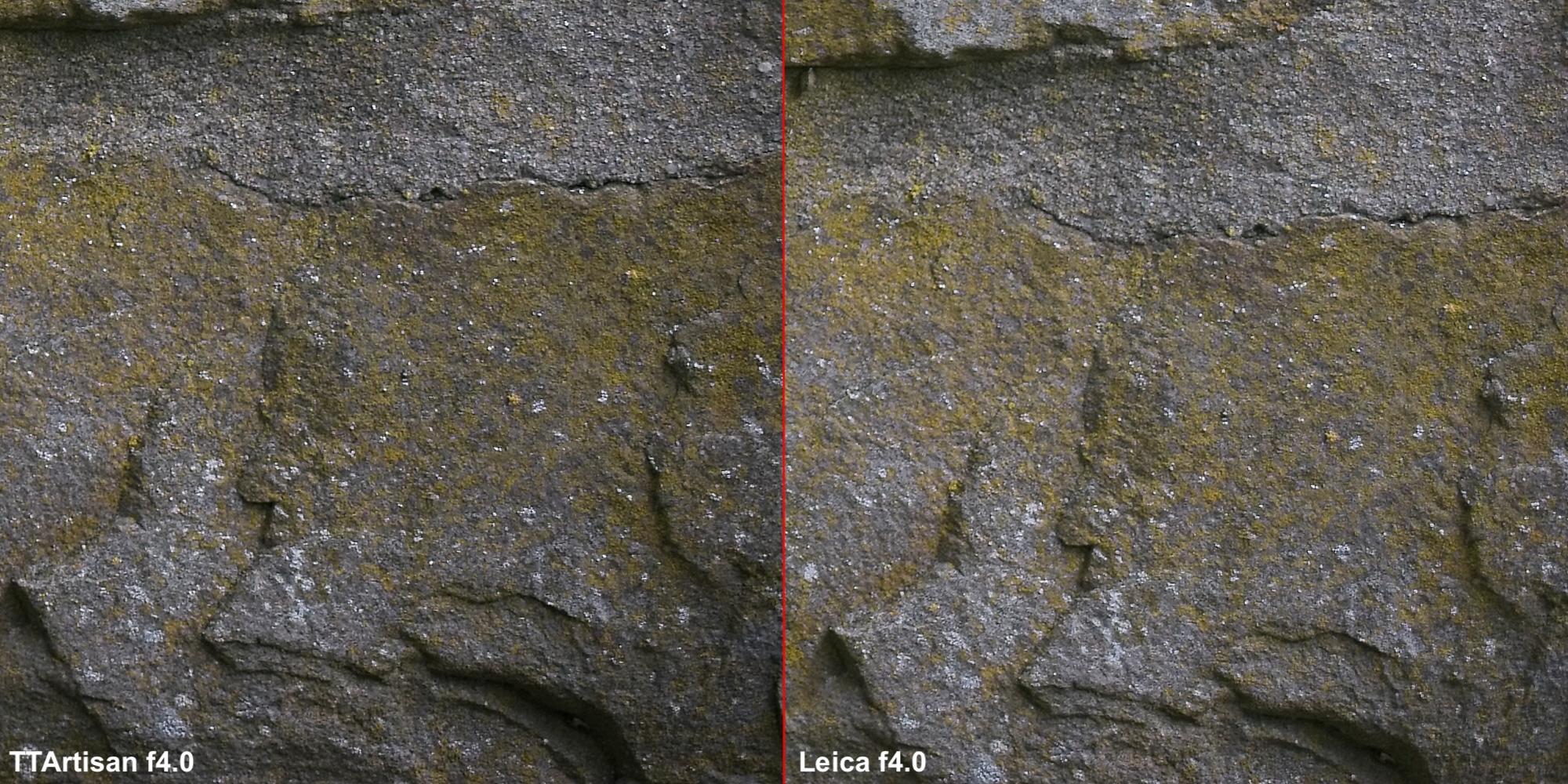 In der Mitte ist das Leica bei Blende 4 nun so scharf, dass man auch bei einem 200%-Crop keinerlei Schwäche sieht; das TTArtisan schlägt sich hier auch sehr gut, kann aber nicht ganz mithalten. Umgekehrt ist es nun bis in die Ecken scharf, während das Leica hier immer noch etwas weicher ist.
