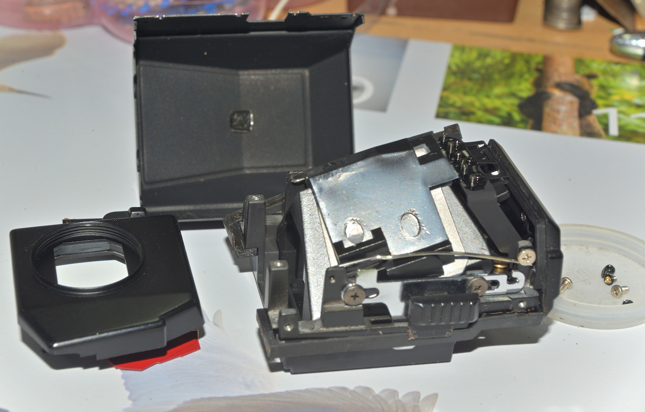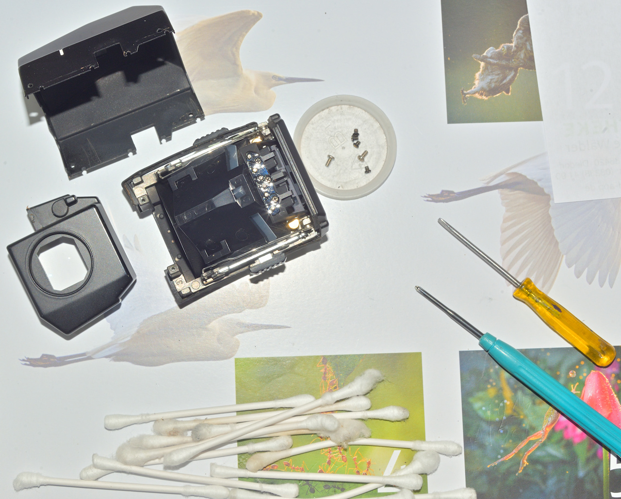 Ein NIKON DE-3 (Sucherprismenaufsatz für die F3 HP) kam mit Pilzbefall auf den Glasflächen zu mir.
