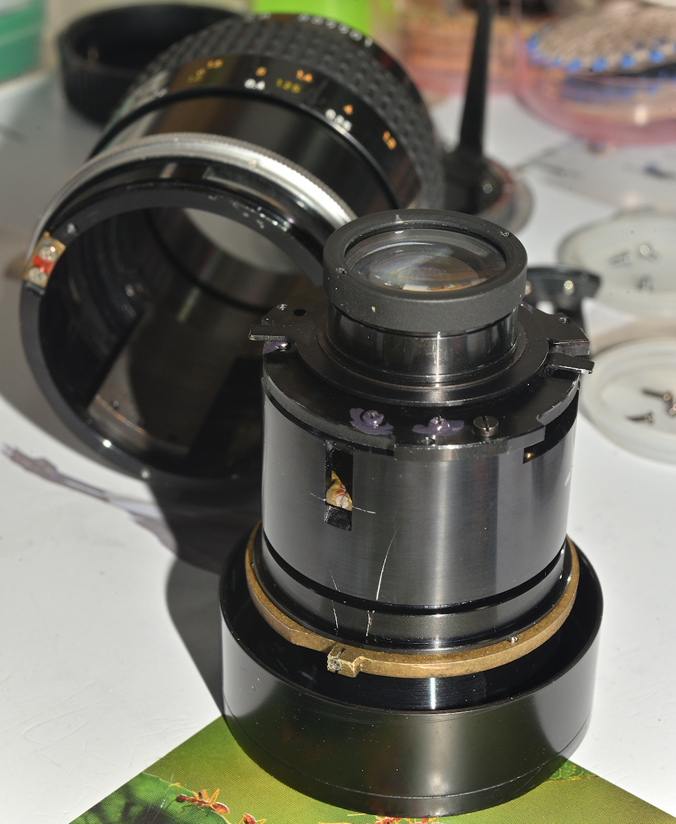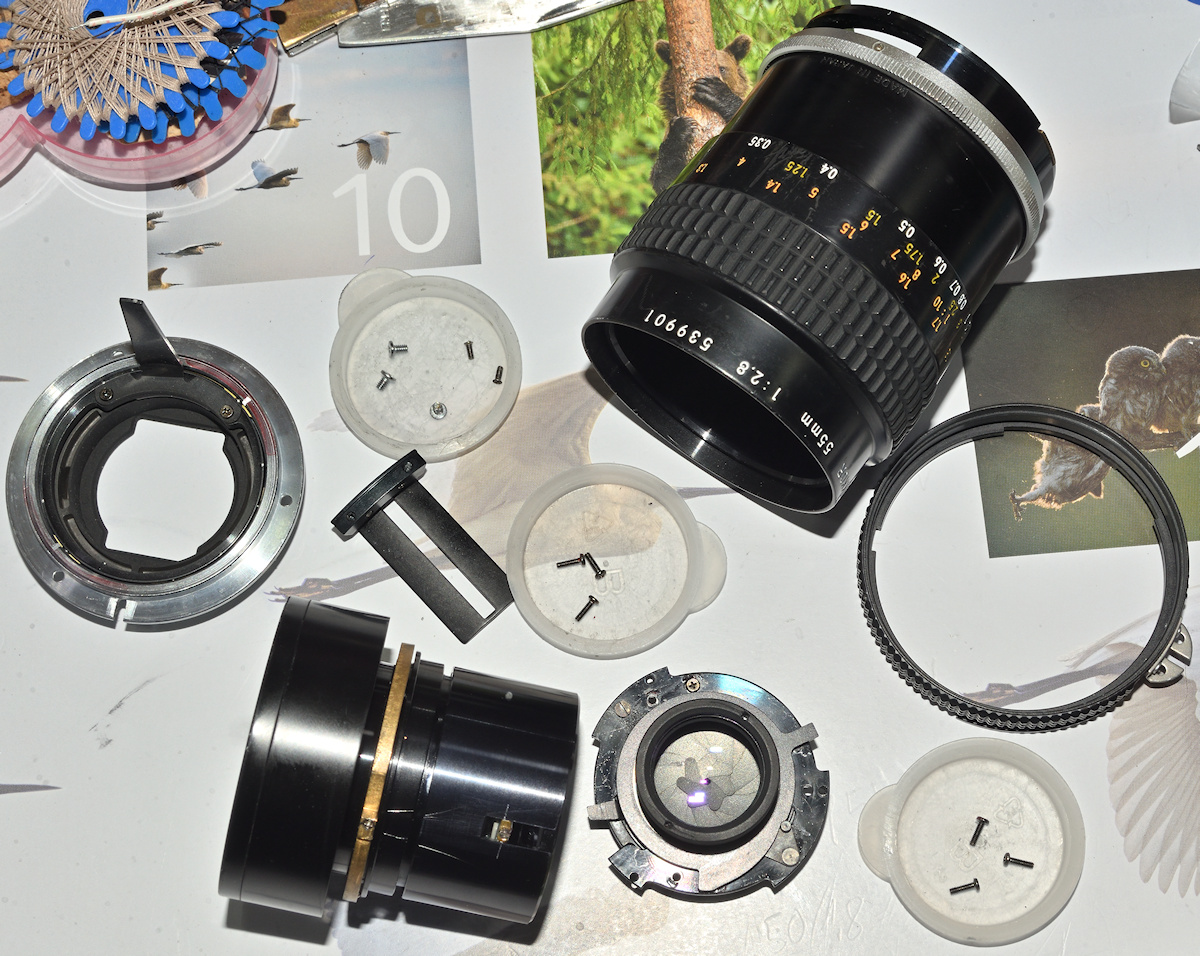 ich bekam ein Nikon Micro-Nikkor 55 mm 1:2.8 AI-S zur Restaurierung zugeschickt, bei dem nicht nur viel Schmutz außen und innen und im Fokusgewindefett war, sondern auch (häufiger Fehler!) das Fokusgewindefett zäh geworden war, gleichzeitig schloss natürlich auch (häufiger Fehler!) die Irisblende etwas langsam, da sie durch das aus dem Fokusgewinde ausgetretene Öl verklebt war.
