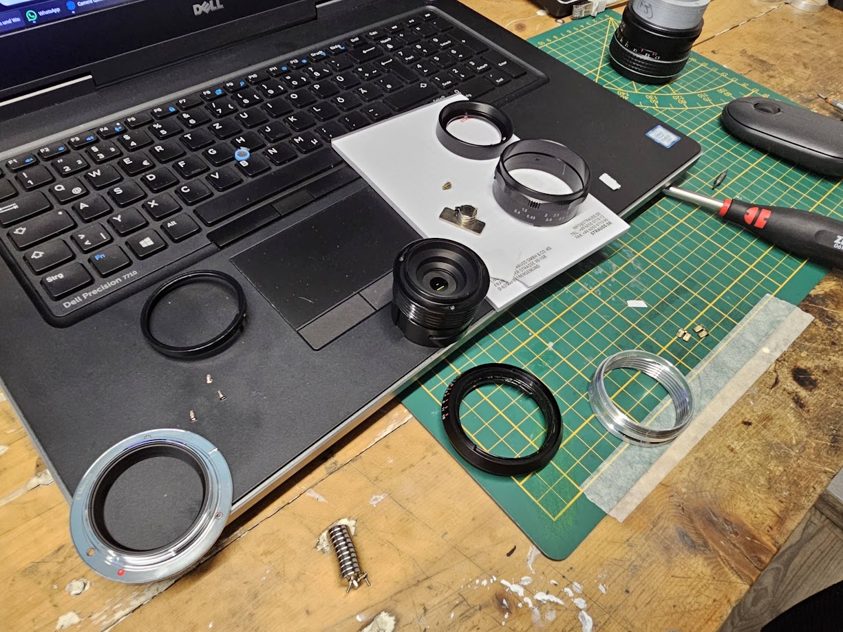 Als ersten habe ich ein paar grobe Messungen mit dem Messchieber getätigt, um zu schauen ob das überhaupt was werden könnte. Rein rechnerisch müsste das letzte Linsenelement des Objektivs schon im AF-Adapter sitzen, um auf unendlich fokussieren zu können. Um mir das genauer anzusehen, habe ich das Objektiv erst einmal zerlegt.
