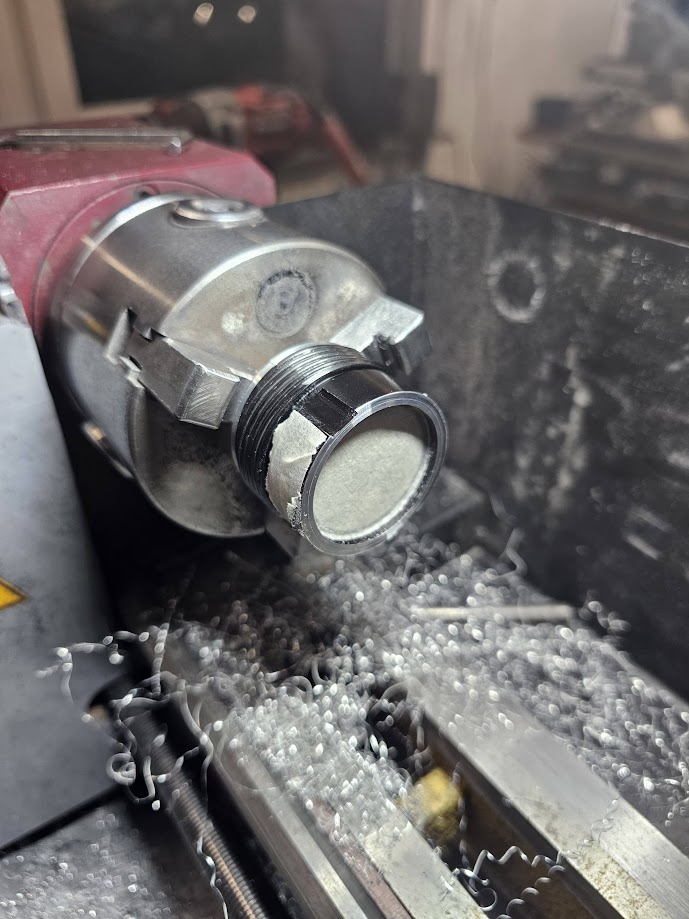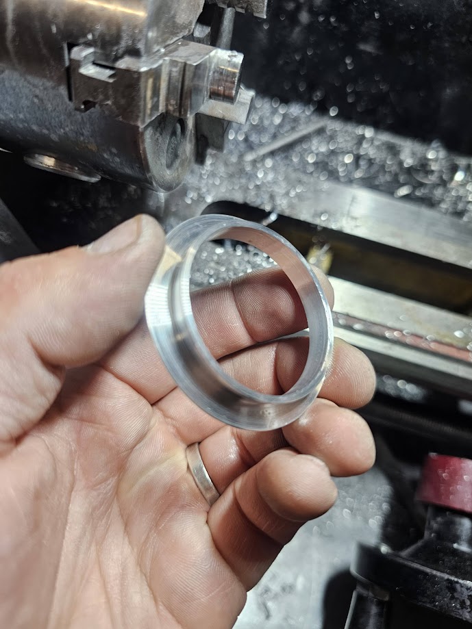 In der Schrottkiste habe ich noch eine alte Riemenscheibe von irgendeinem CNC-Projekt gefunden. Aus dieser habe ich ein ziemlich filigranes M-Bajonett als Gegenstück für den Adapter gebaut. Da ich die manuelle Fokussierbarkeit des Objektivs beibehalten wollte, musste sich das Linsensegment ja noch im Bajonett bewegen können. Das M-Bajonett habe ich vorher schon für ein anderes Projekt im CAD gezeichnet. Die Aluminium-Version habe ich mehr oder weniger frei Hand auf die Schnelle gemacht. Da ich die Idee später wieder verworfen habe, hänge ich nur die Bilder an ohne näher drauf einzugehen.
