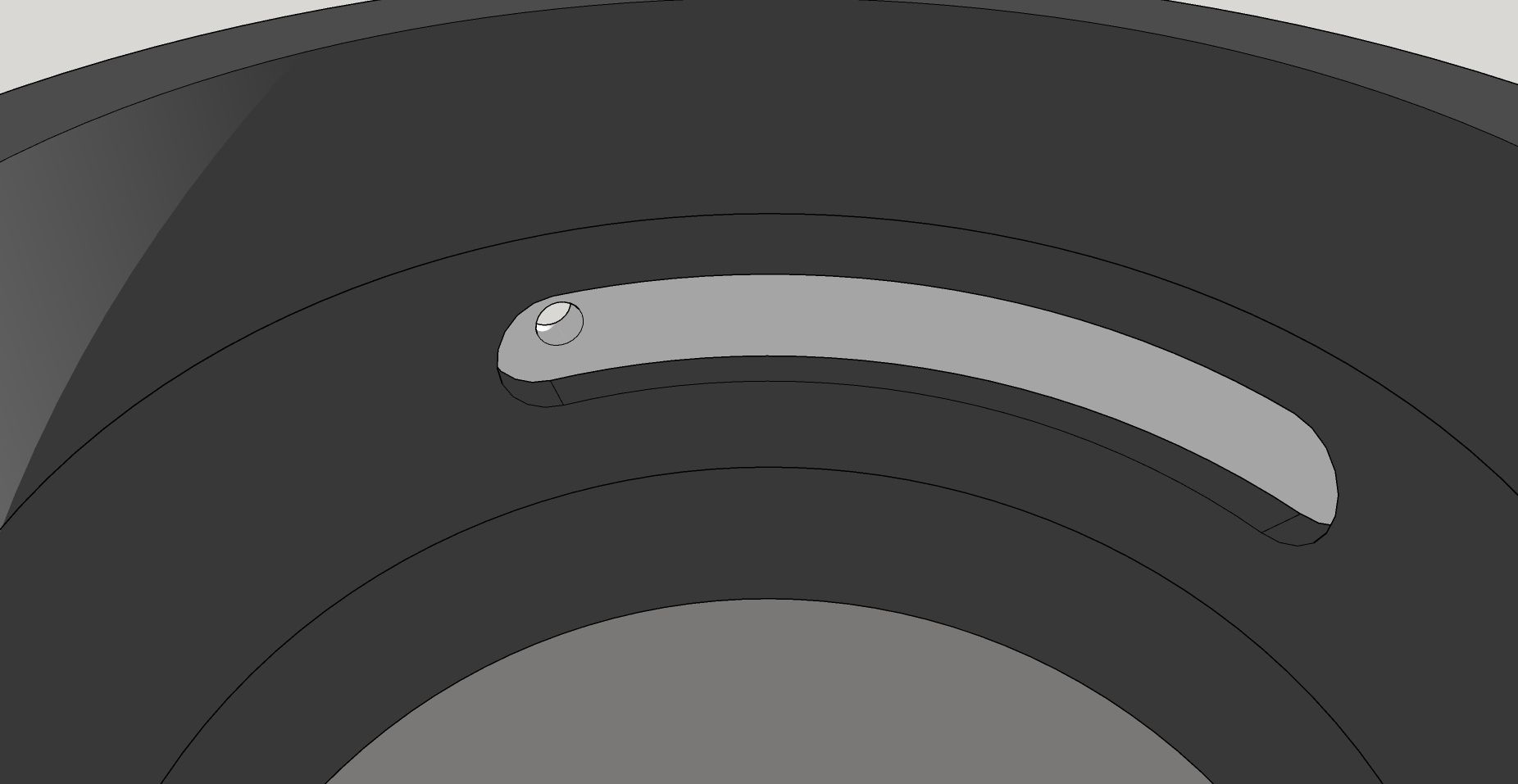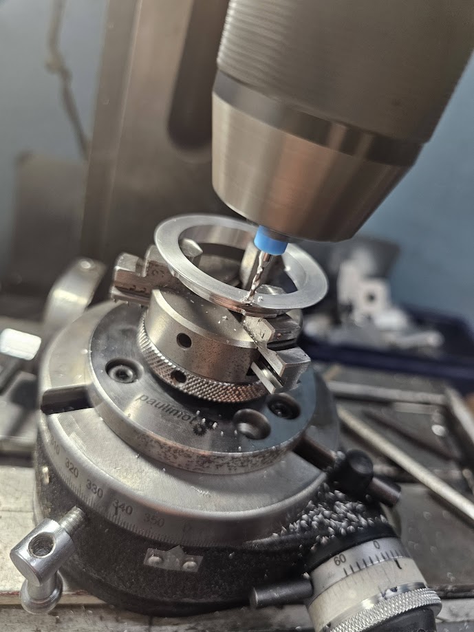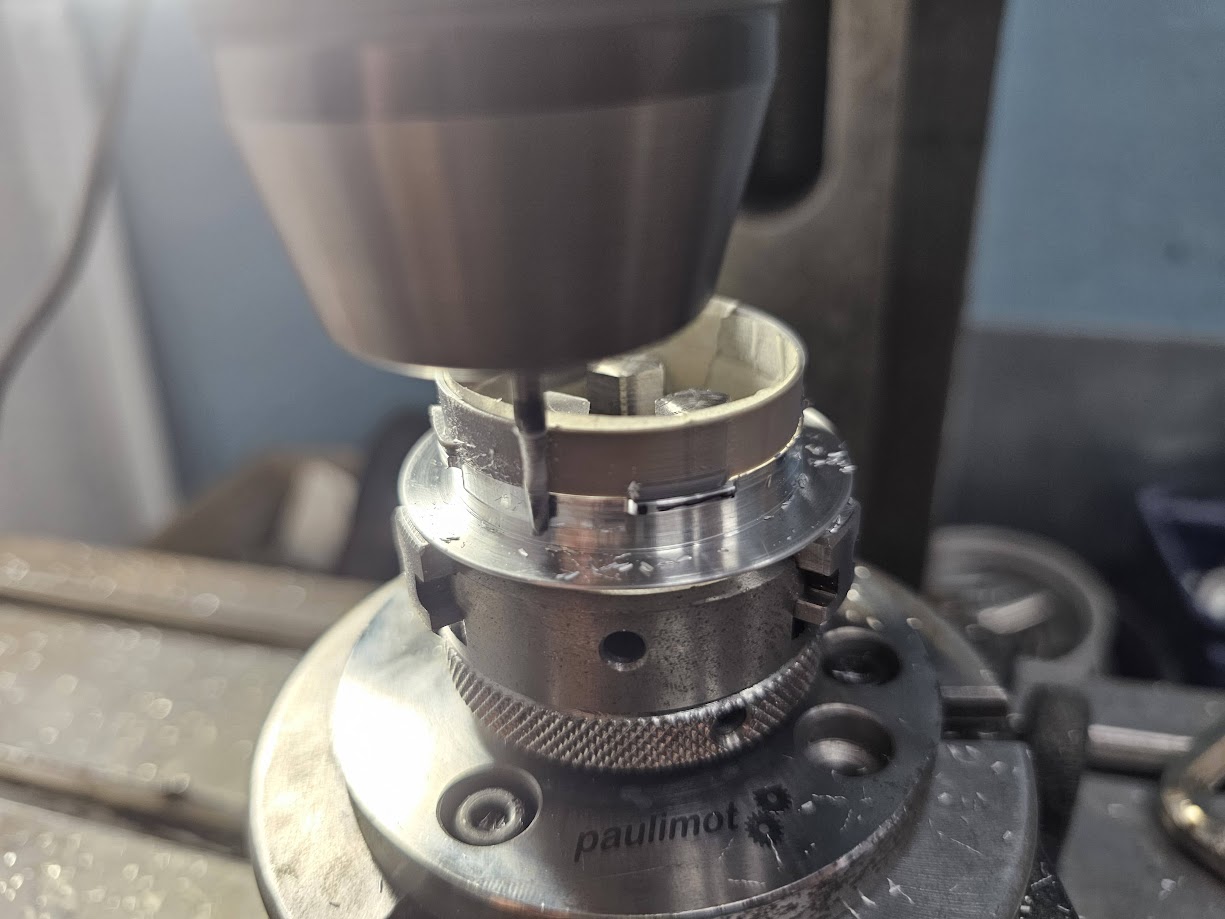 Für die Blendenverstellung habe ich parallel zur bestehenden Nut eine neue mit etwas größerer Breite gefräst. Die Länge der Nut habe ich einfach in der selben Aufspannung abgetastet. Die Verstellung lässt sich um ziemlich genau 82° bewegen (von Anschlag zu Anschlag). Nomrla nimmt man zum fräsen kein Borhfutter, aber sollte ja schnell gehen...