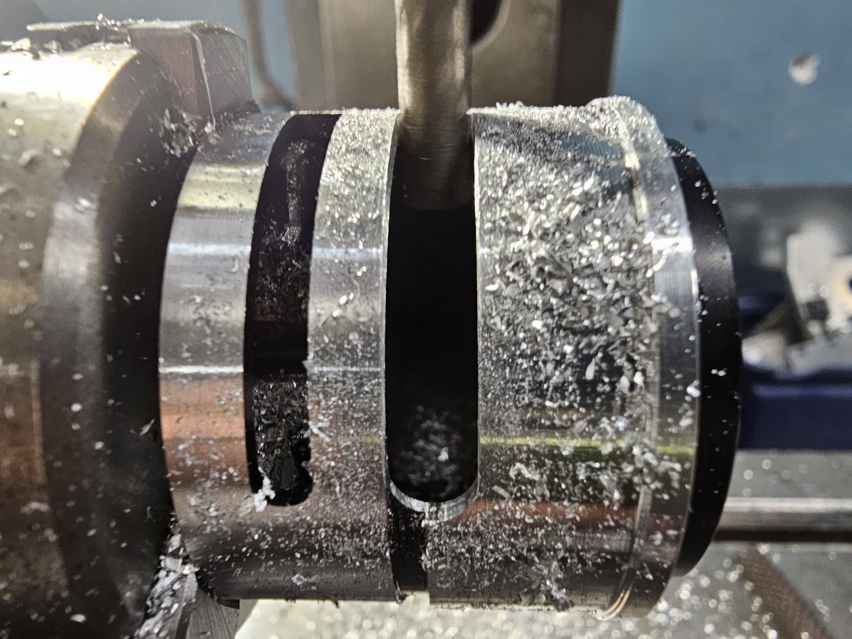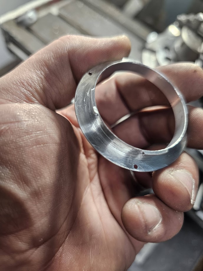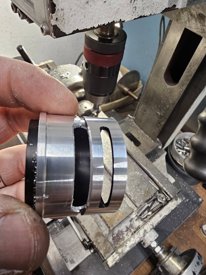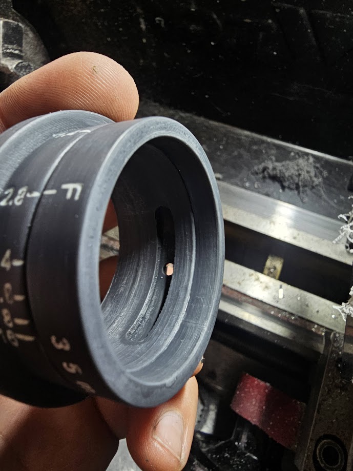 Hier sieht man die Hülse, welche die Blendensegmente antreibt. Auch diese benötigt natürlich eine neue Bohrung für die spätere Betätigung von außen.