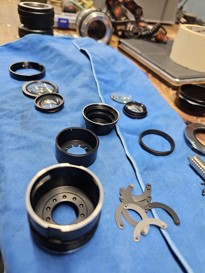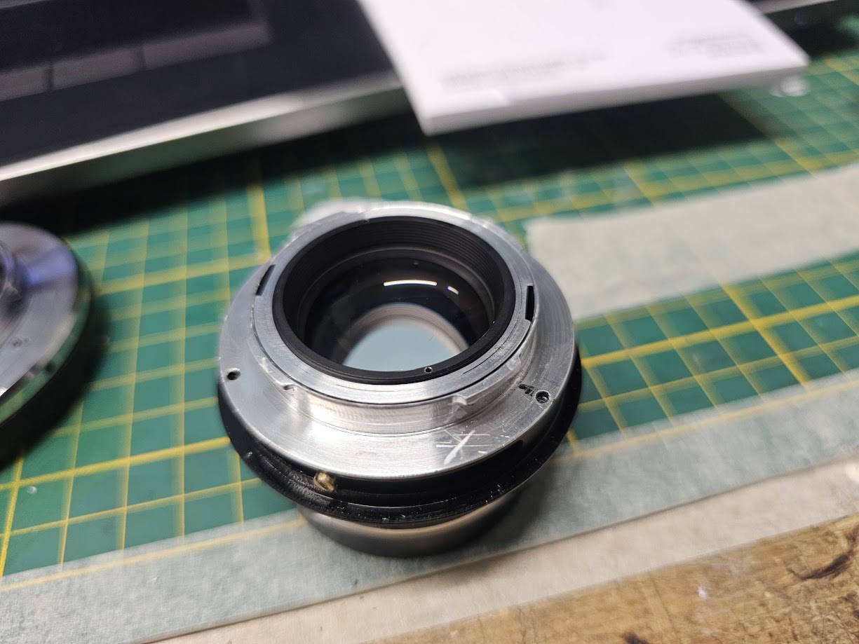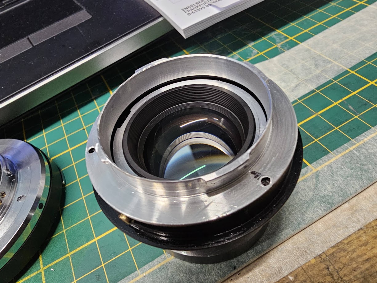 Nach einer halben Dose Bremsenreiniger und 100L Pressluft habe ich das ganze Linsensegment wieder zusammengesetzt. Am fummeligsten war die Blende. Diese sind übrigens aus Stahlblech, also ebenso sehr hochwertig gefertigt.