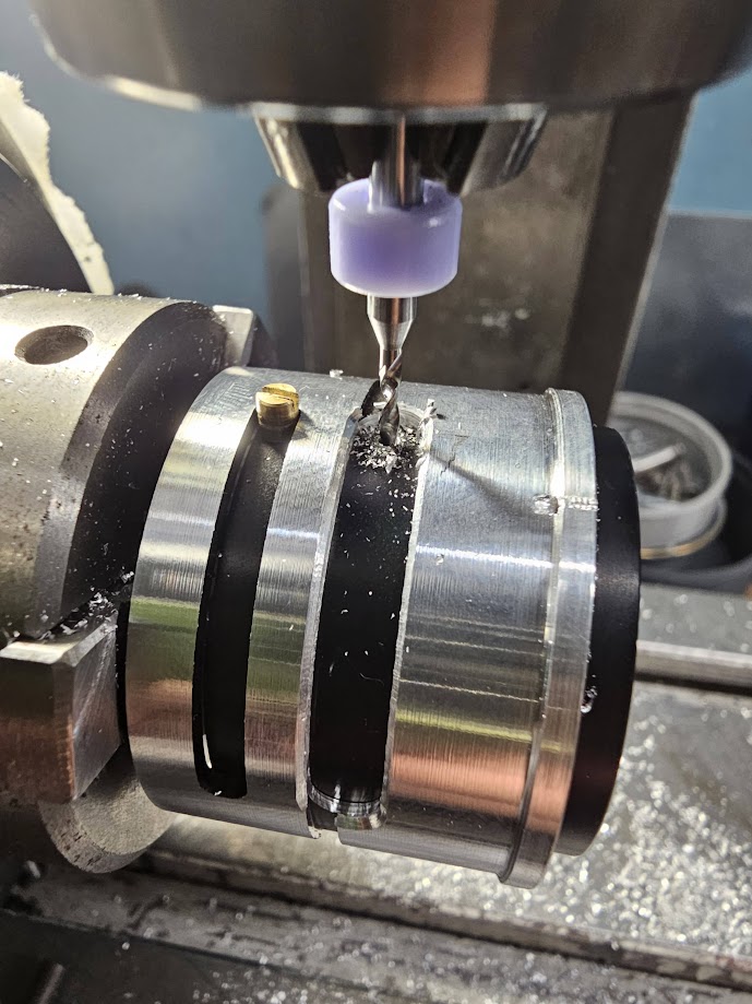 Das Gehäuse hat ebenfalls eine Nut, welche sich mit der gefrästen Nut im Linsenträger deckt. Am späteren Fokusring sieht man ein Loch für die spätere Verbindung mittels M2-Schraube.