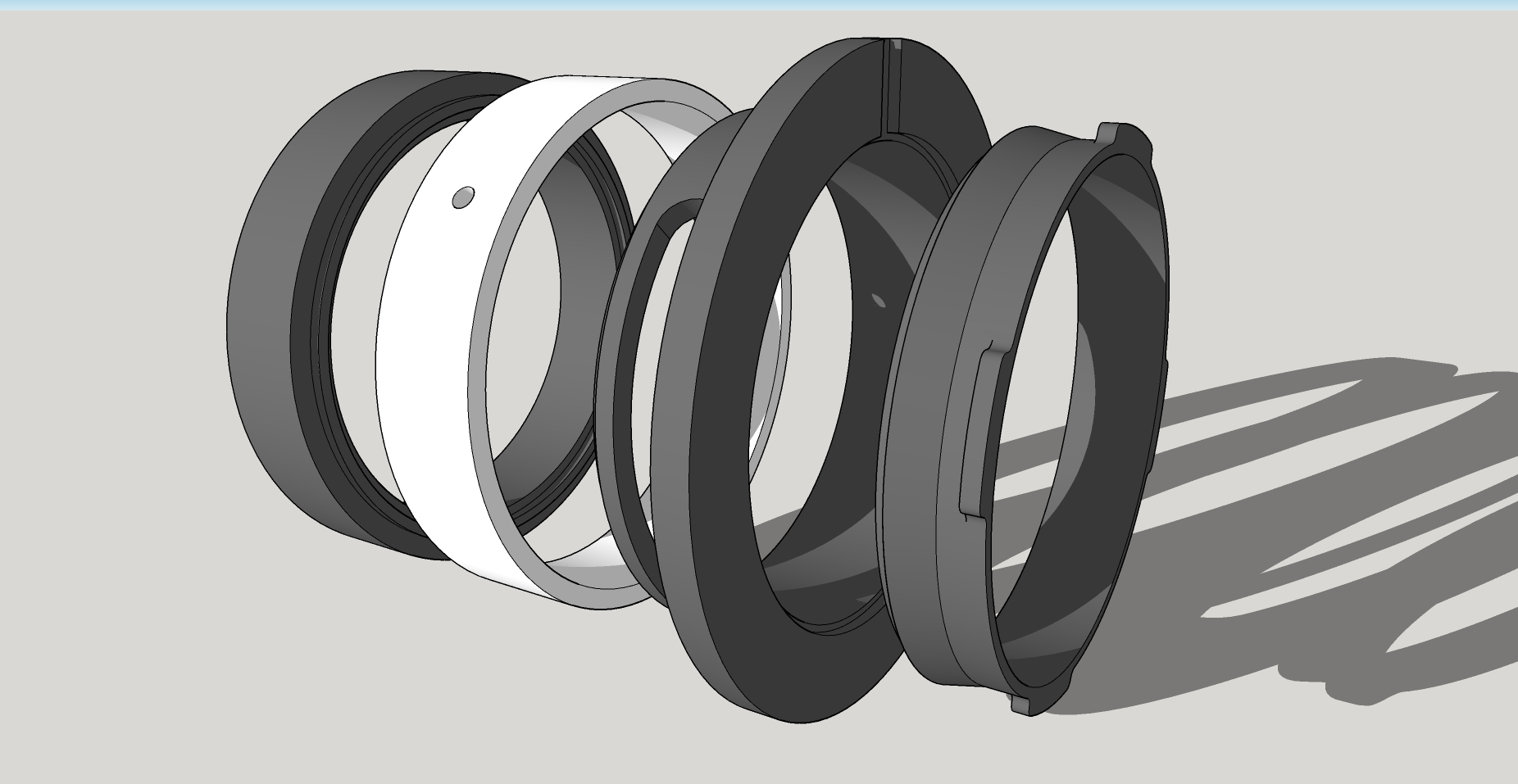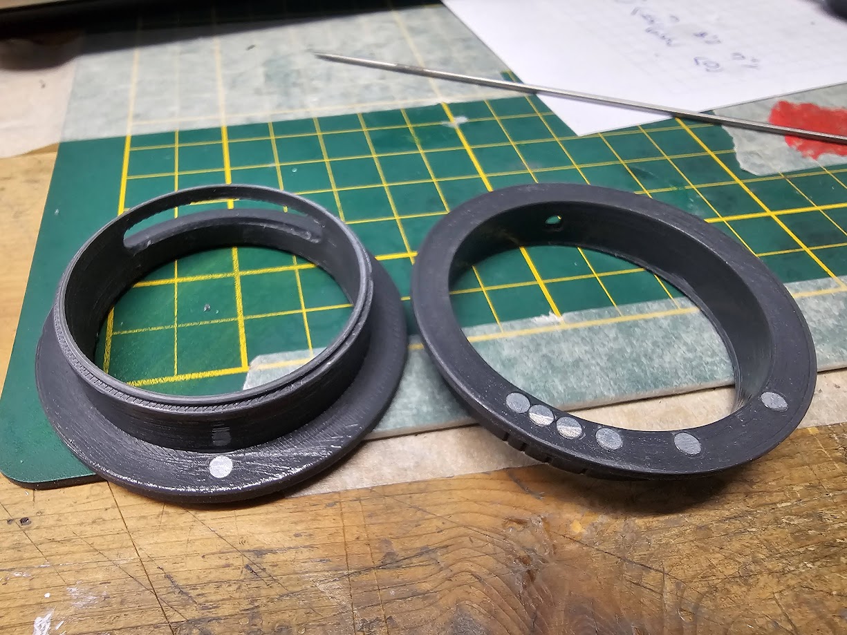 Für den Blendenring habe ich noch eine Rastung mit kleinen Neodymmagneten reingequetscht. Die Magnete haben 3x1mm und sind so angeordnet, dass sie sich anziehen. Dadurch entsteht beim drehen eine weiche, aber punktuelle Rastung.