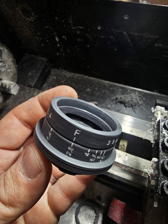 Die Markierungen für die Blende sind bereits vorgesehen (die Winkel habe ich mit dem Teilapparat auf der Fräsmaschine am originalen Einstellring abgemessen).