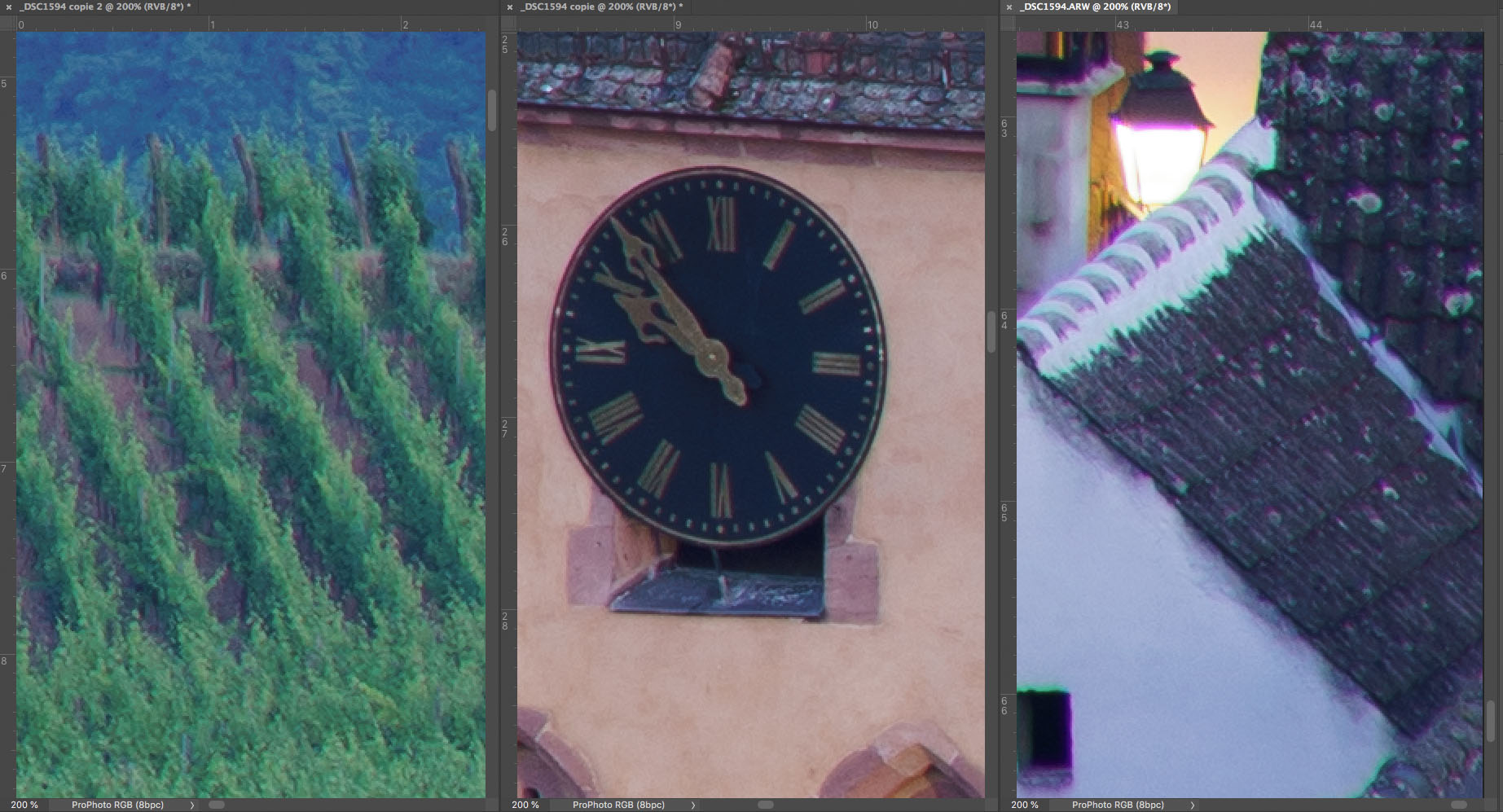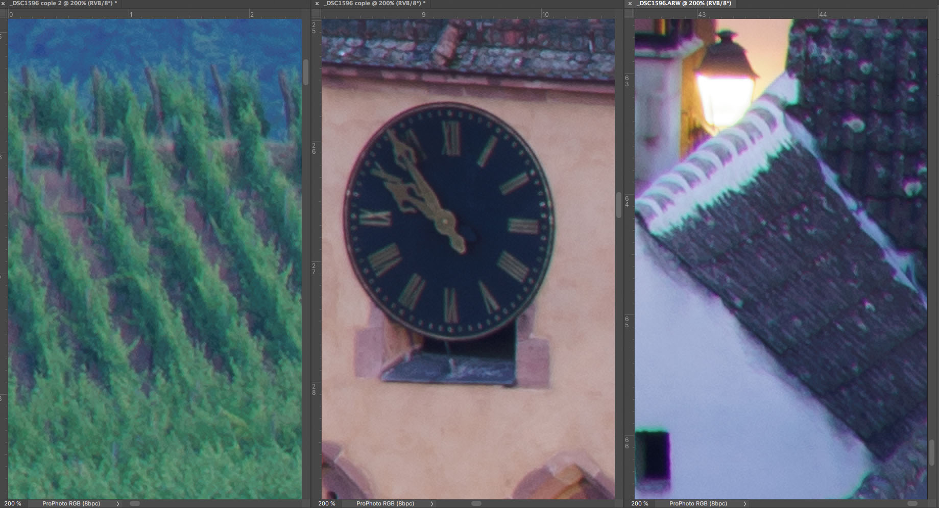 Wie üblich zeige ich Euch hier eine Testserie von f/2,8 bis f/16, die mit der Sony A7R II (42 Mpix.) nebst Stativ und 2 Sekunden Selbstauslöservorlauf bei 100 ISO fotografiert wurde. Ich habe mit maximaler Lupenvergrösserung und offener Blende auf die Kirchturmuhr scharfgestellt. Es handelt sich hier um fast ungeschärfte Ausschnitte in 200% - Vergrösserung, die Korrektur der chromatischen Aberrationen wurde in Adobe Camera Raw desaktiviert.