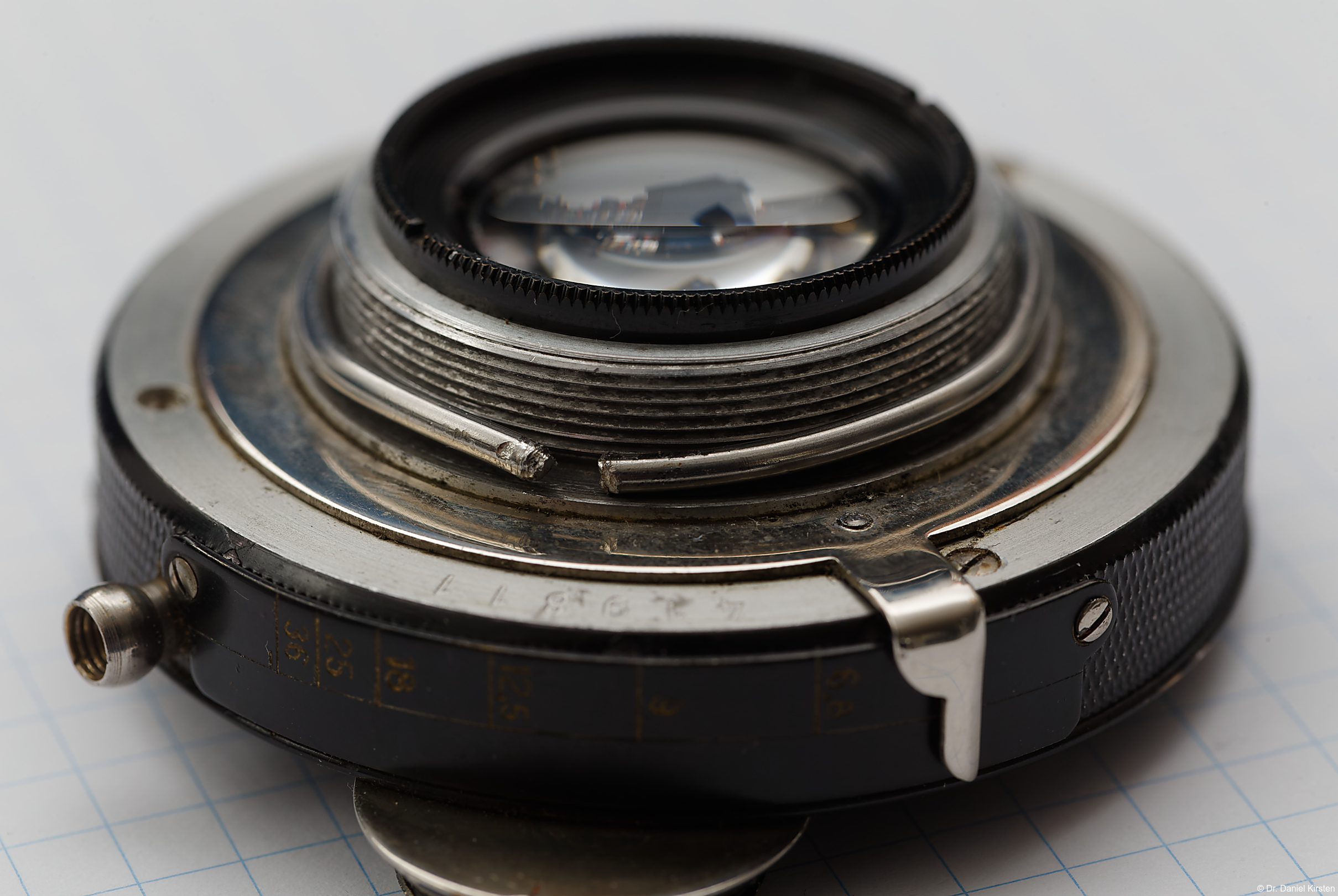 Ein Bild von der Linsenreinigung. Das Objektiv besteht aus zwei nicht verkitteten, zueinander