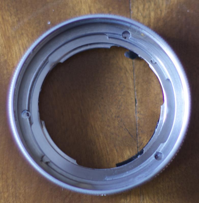Im Moment ist - weil ich ihn zufällig da liegen hatte - das Objektiv mit einem M42-Adapter und einer 1,0mm dicken Alu-Scheibe adaptiert. Da die drei Befestigungsschrauben eine Kopfhöhe von 1,0mm haben, verbleibt nach dem Senken im M42-Adapter eine Reststärke im Adapter von 0,5mm. Bei einem Objektiv dieser Gewichtsklasse (ca. 600g) ist mir das zu riskant.