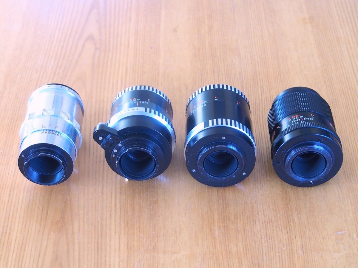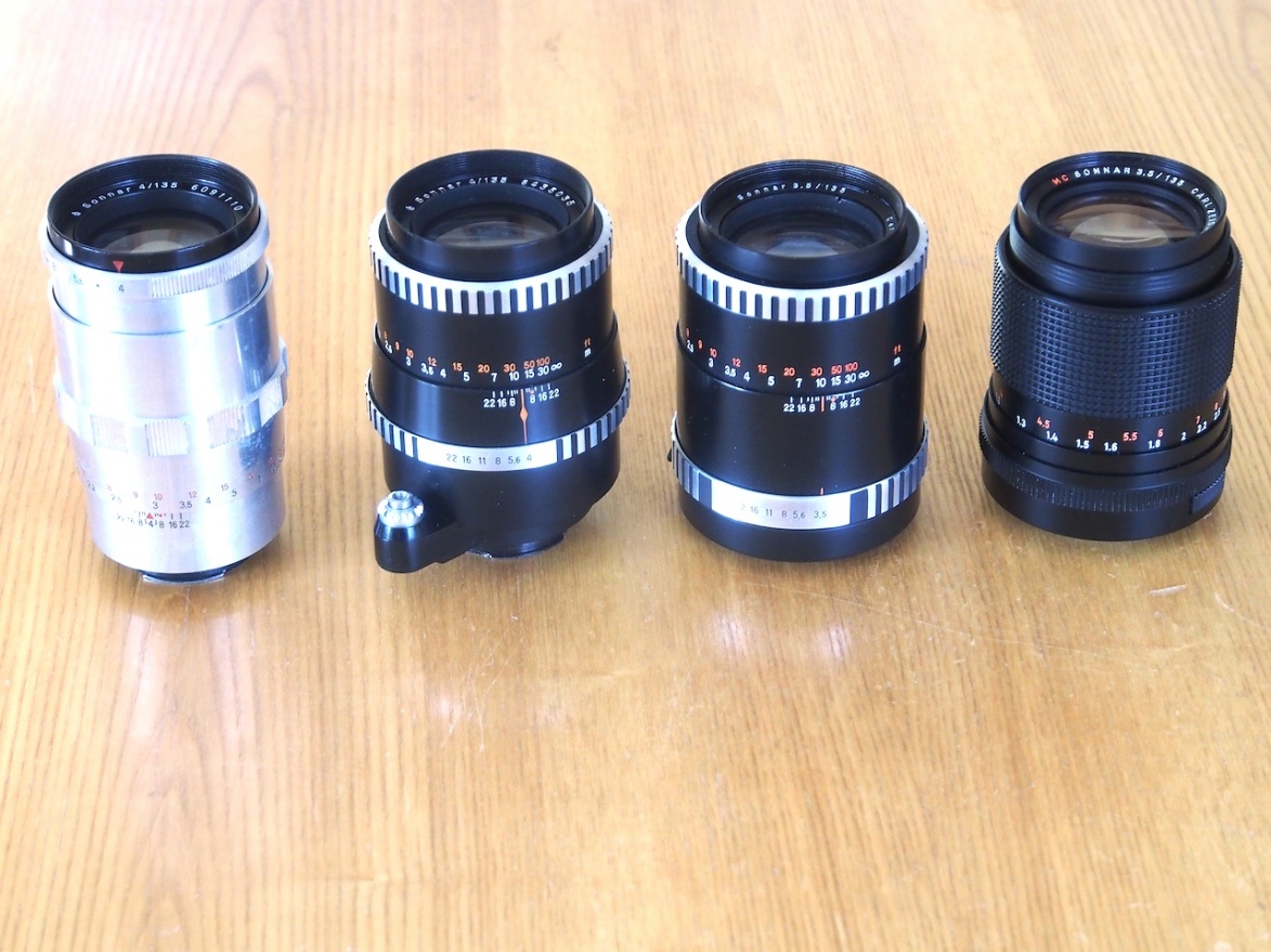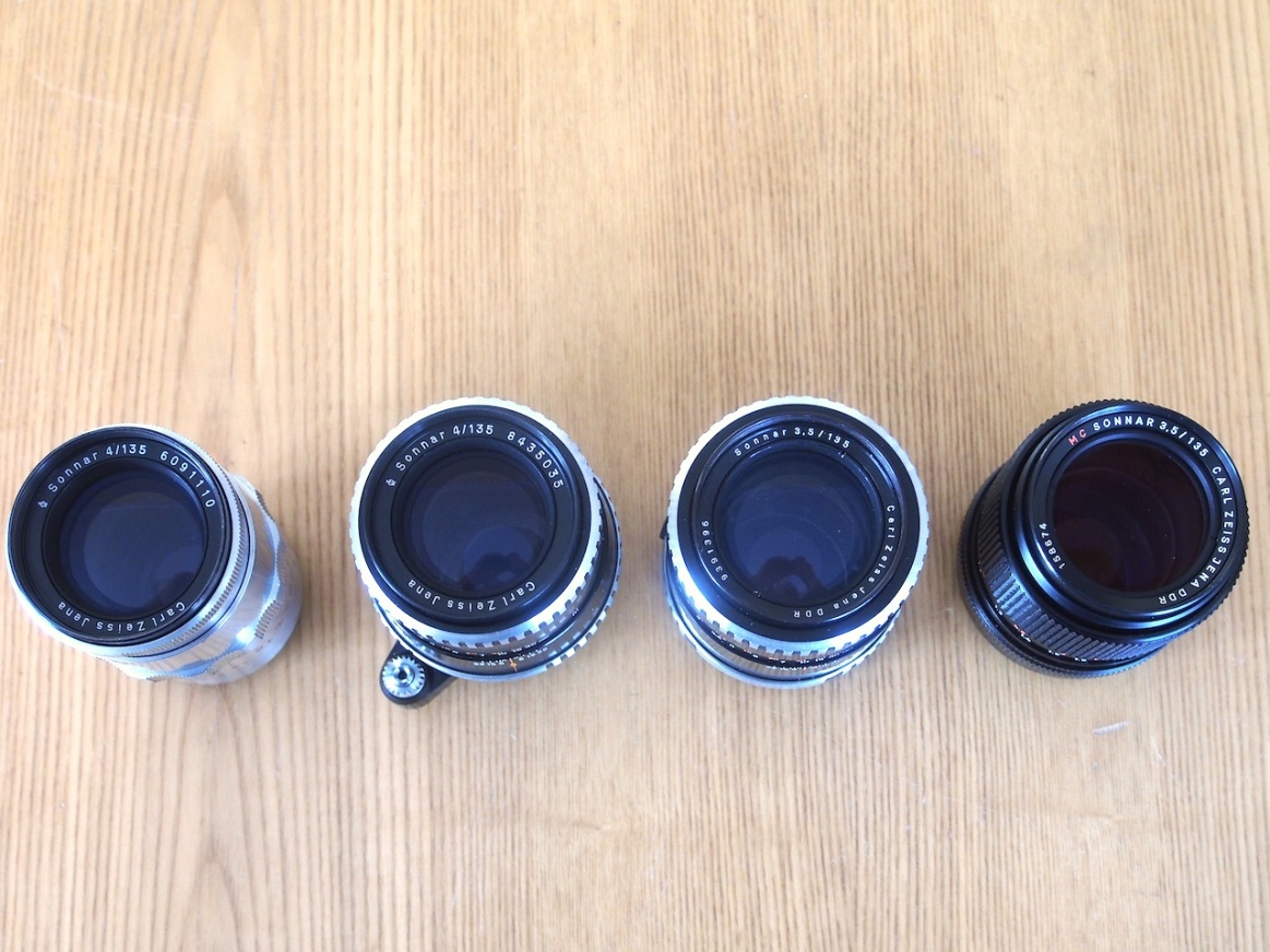 Die beiden linken Exemplare sind Sonnare 4/135 für EXA-Anschluß, die beiden rechten Exemplare sind Sonnare 3,5/135 für M42.