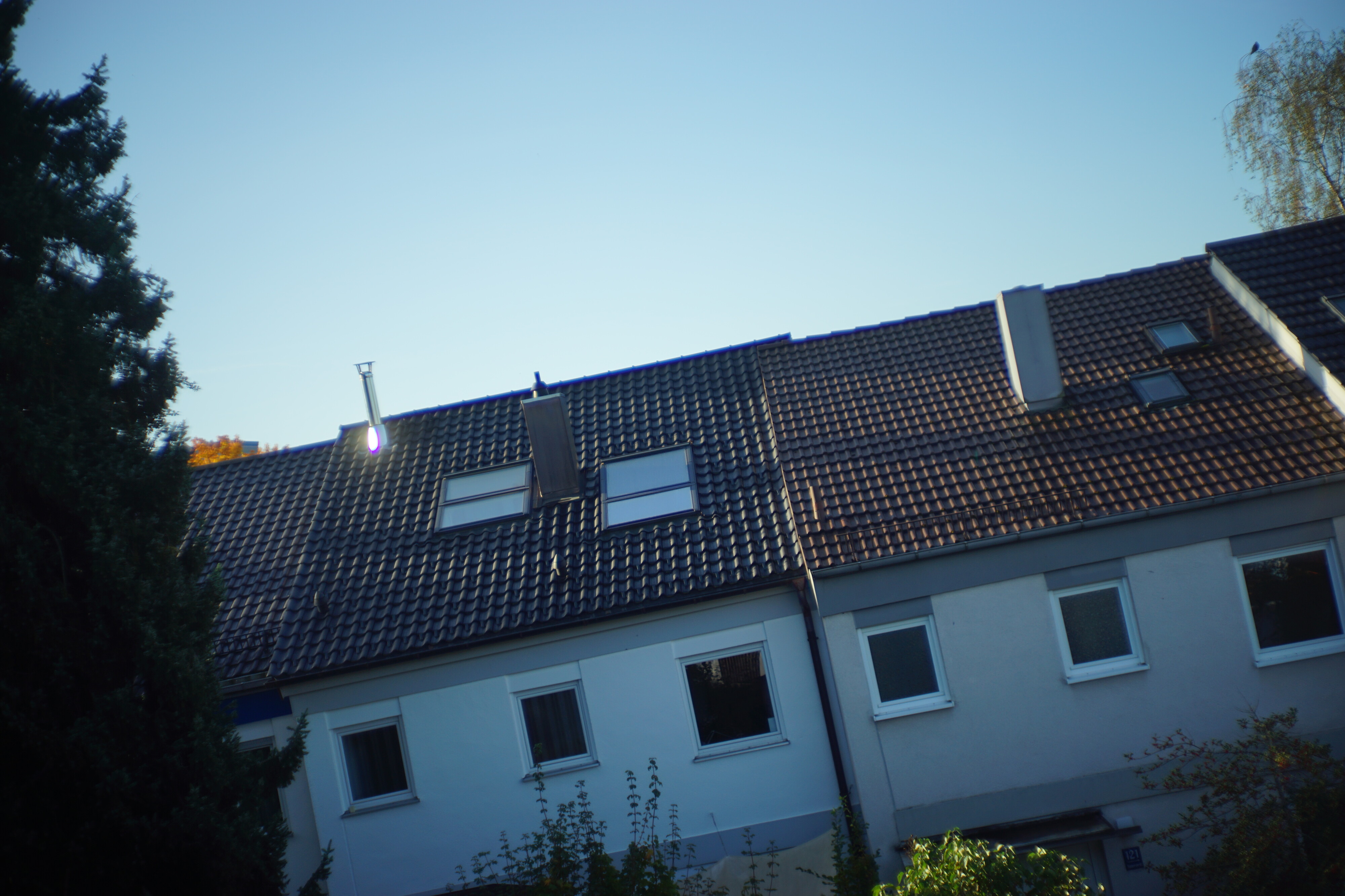 Bei Offenblende in einem kleinen Bereich im Zentrum halbwegs scharf und kontrastreich, ansonsten eine Ansammlung aller nur denkbarer optischer Fehler. Sonnenlicht auf Metall (der kleine Metallkamin) mag es gar nicht.