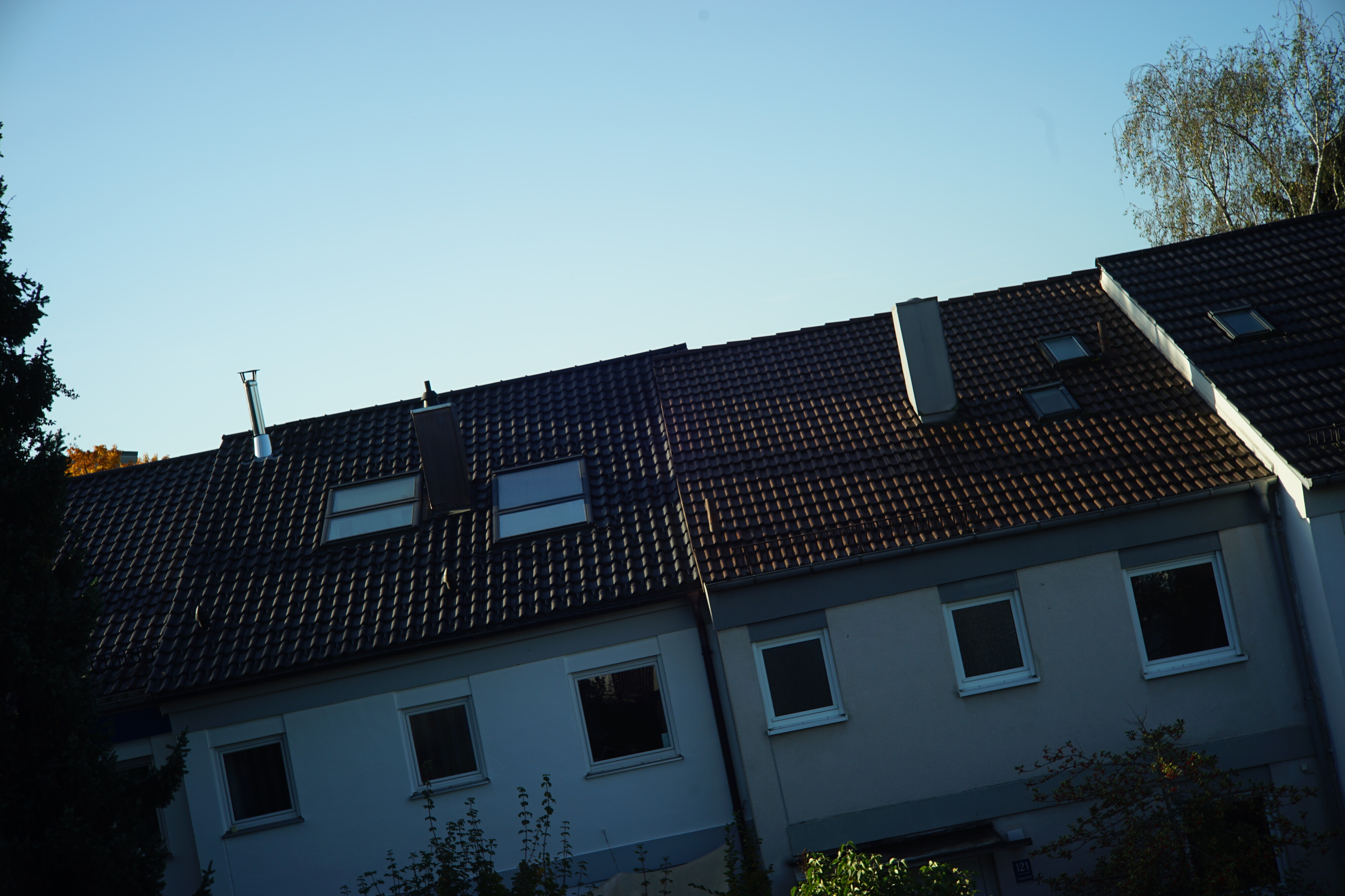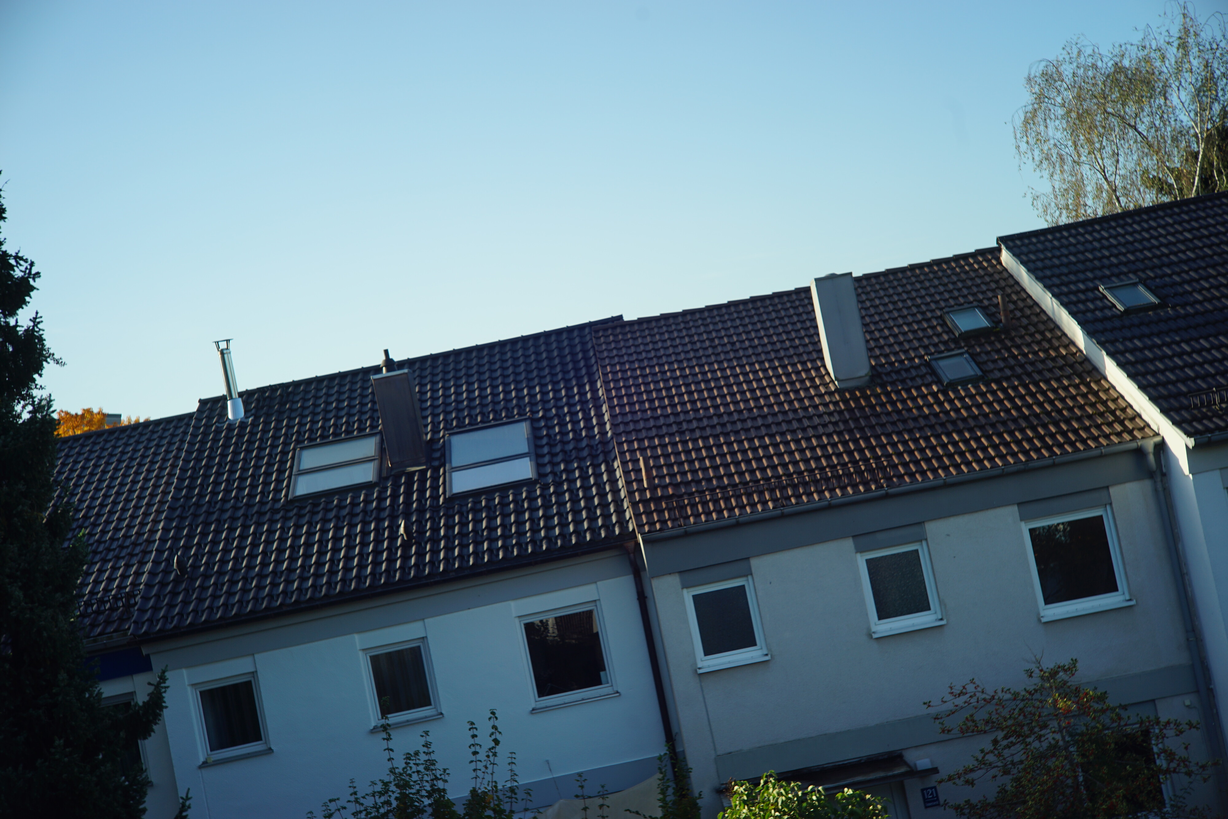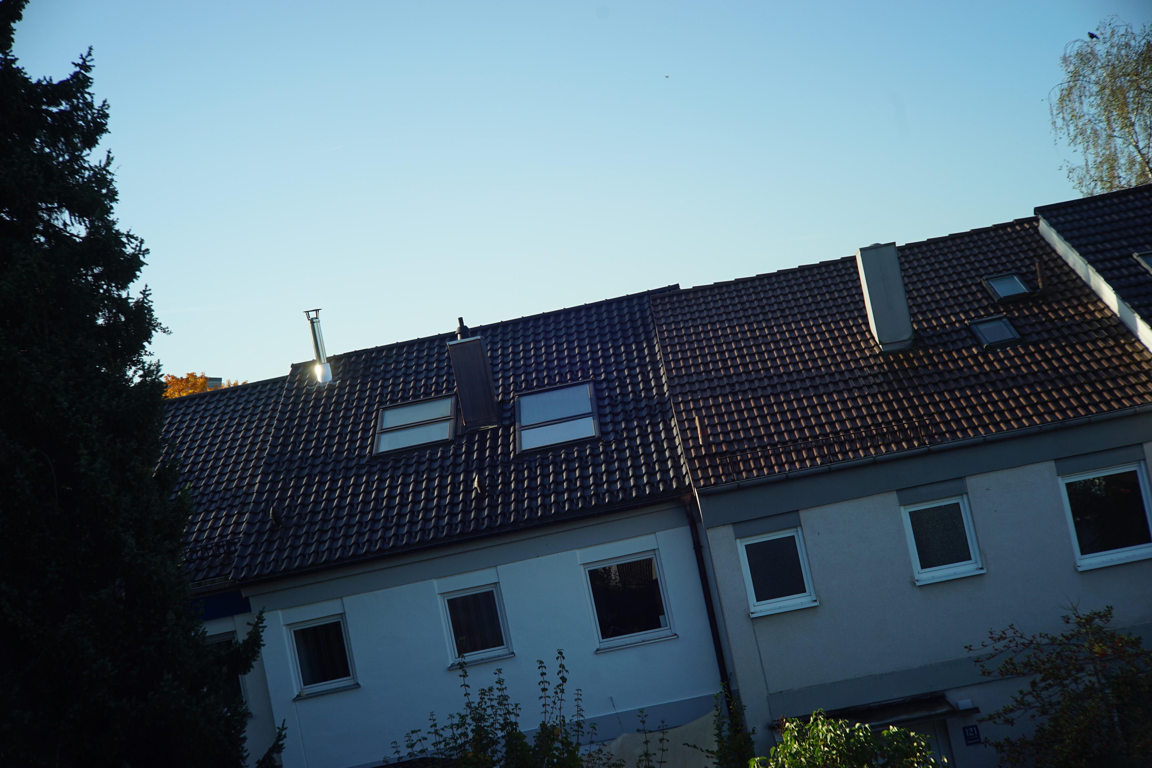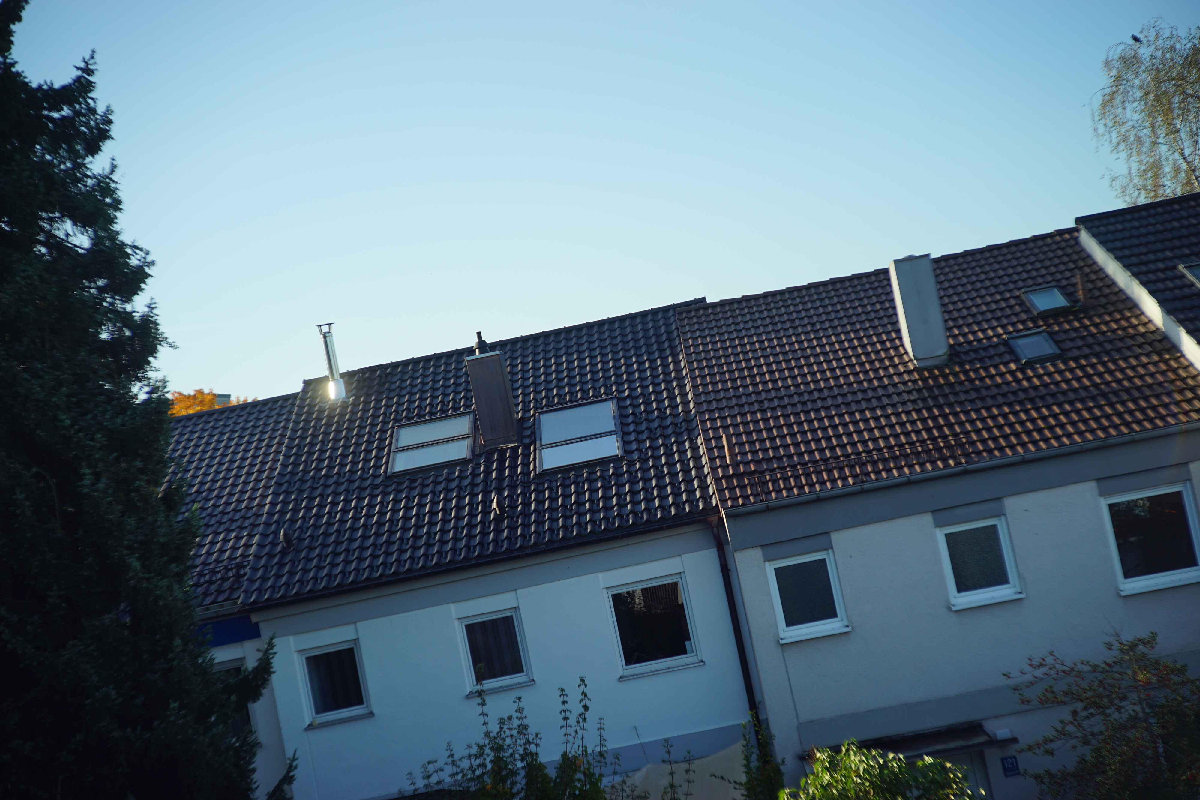 Bei f2.8 macht es einen Sprung, wird in der Mitte scharf und kommt jetzt auch mit dem sonnenbeschienenen Metallkamin klar. Ränder und Ecken verbessern sich nicht.