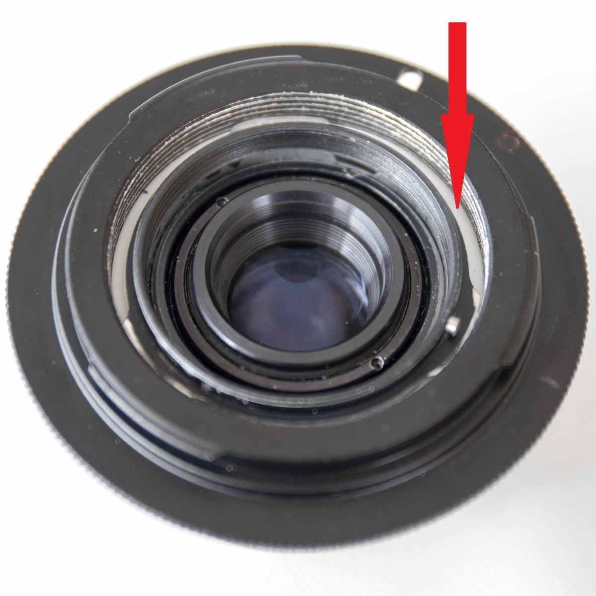 Für die "dauerhafte" Verbindung des Objektivs mit dem Adapter habe ich mich für Sekundenkleber entschieden :shocking: , von der Objektivseite her zugeführt :beten: . Da hat geholfen, dass der v.g. Gleitring wunderbar den Sekundenkleber im Spalt zwischen Gleitring und M42-Gewinde wie auch des oberen Auflageflansches belassen hat.