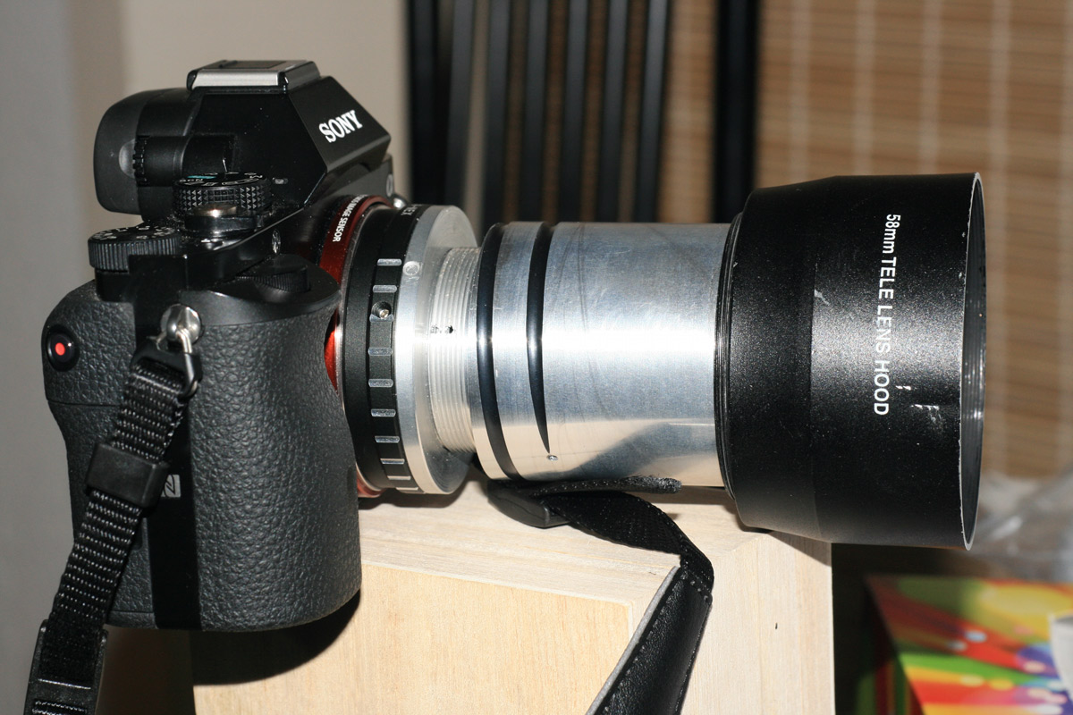Eine 58mm Tele - Streulichtblende aus Metall läßt sich von hinten gut über den Tubus "stülpen" und sitzt stramm auf dem 52,5mm Tubus des Meostigmat...