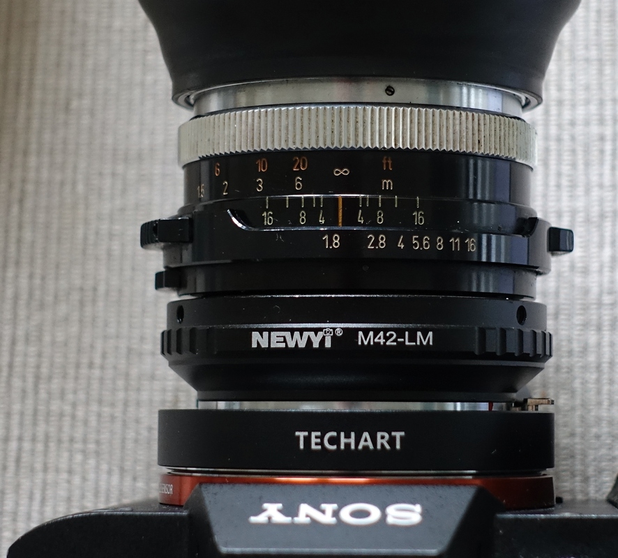 Die Adaption Leica-M auf M42 erledigt ein Adapter von NewYi, der die notwendige Schräge hat,