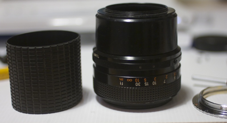 Der Lichtschutz ist nicht ganz so toll geraten, da die von mir verwendete Sonnenblende einen geringfuegig zu grossen Aussendurchmesser hatte und hin- und herwackeln konnte. Ich habe mir damit beholfen sie auf einer Seite mit etwas Heisskleber festzumachen. Nun laeuft sie mit dem Blenenring mit und sie sitzt auch nicht ganz koaxial zentriert. Dadurch ensteht eine winzige Oeffnung durch die moeglicherweisse unter ganz widrigen Bedingungen etwas Licht reinkommen koennte. Da es allerdings da direkt am Camerabody ansitzt und das Licht um ein paar Ecken muesste, mache ich mir keine grossen Sorgen. Wenn ich ein Teil mit besser passendem Durchmesser finde, werde ich das bei Gelegenheit mal noch etwas schoener machen, aber aktiv danach suchen werde ich erstmal nicht.