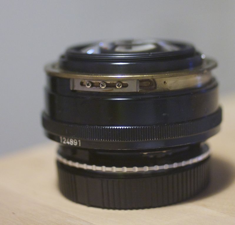 2. Rueckstellfeder fuer die Blende modifizieren. Leider war das die einzige Feder aus dem Fundus. Wenn ich bei Blende 1.2 bin und abblende, bleibt sie erst mal bis Blende 4 (oder so) haengen und schnalzt dann ploetzlich los. Dann kann ich aber wieder Schritt fuer Schritt auf- und abblenden. Nur wenn ich wieder bei 1.2 bin haengts. Ich koennte die Feder etwas kuerzen, aber ich denke ich lass das erstmal so bis mir eine besser geeignete Feder ueber den Weg laeuft.