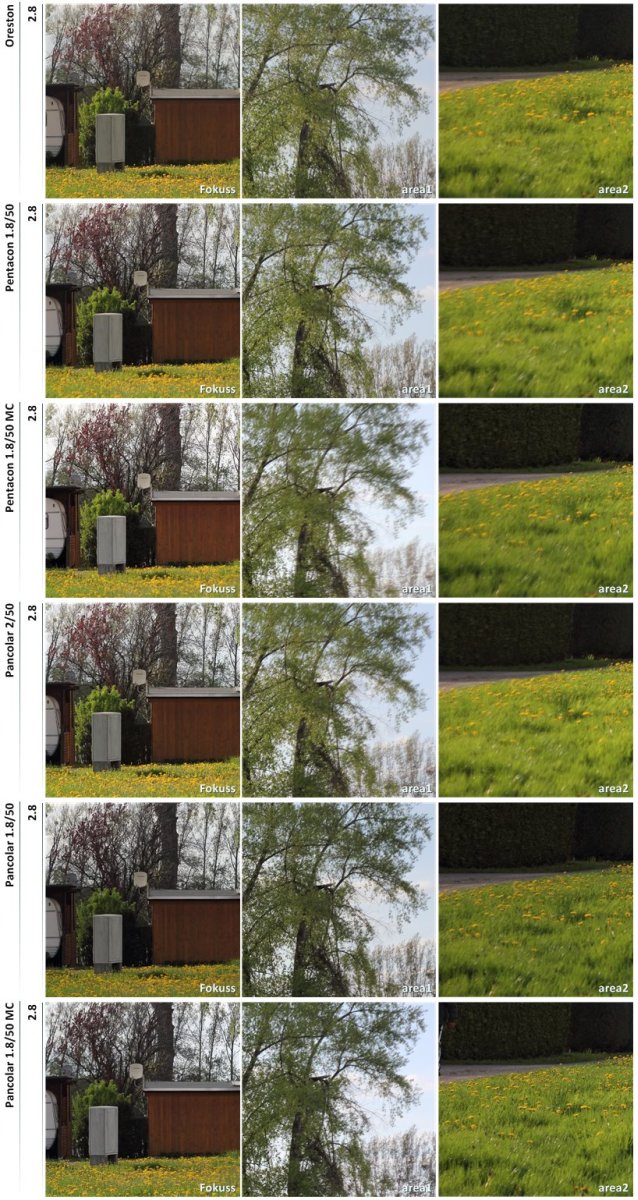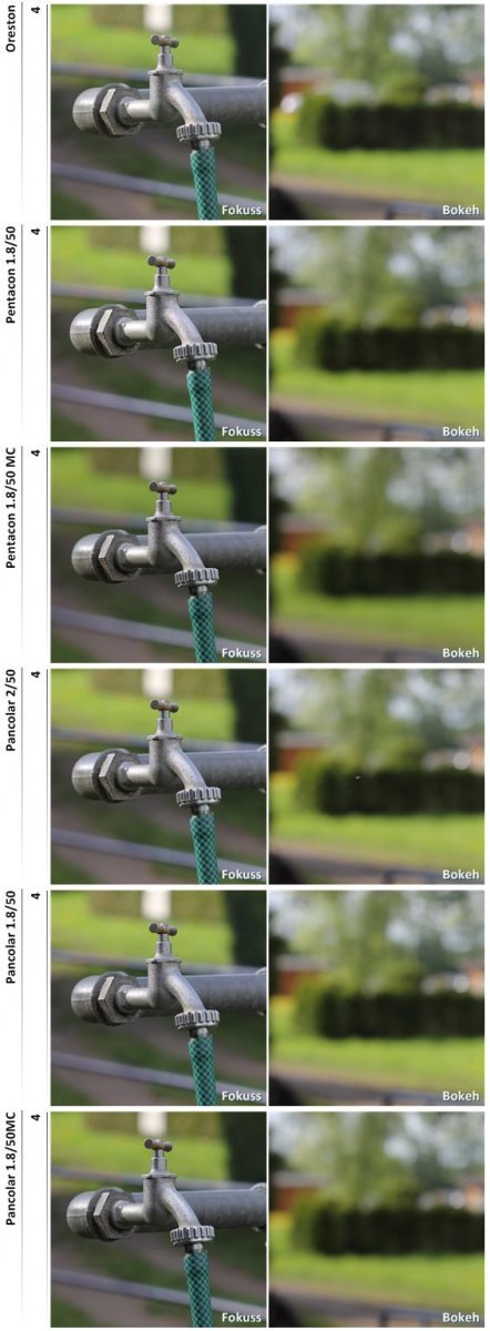 Angetreten sind Meyer Oreston 1.8/50, Pentacon 1.8/50, Pentacon 1.8/50 MC, Pancolar 2/50, Pancolar 1.8/50 und das Pancolar 1.8/50 MC.