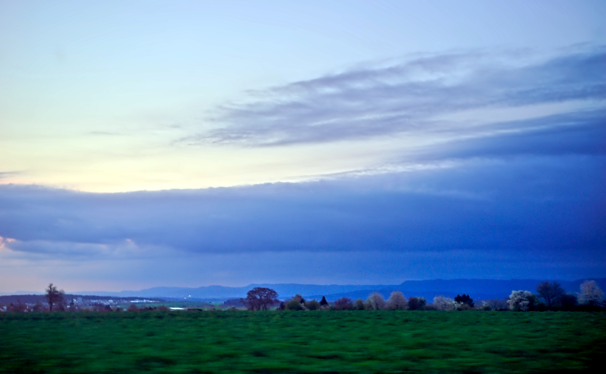 #1: Sonnenaufgang und Wolken, immer wieder interessant. Aus dem fahrenden Auto geschossen (1/25 Sek)