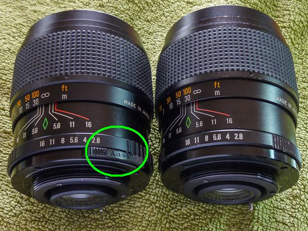 - AM-Umschalter auf A, dann ist der Mechanismus entspannt und erleichtert das Einfangen des Blendenhebels (die beiden Fragezeichen)