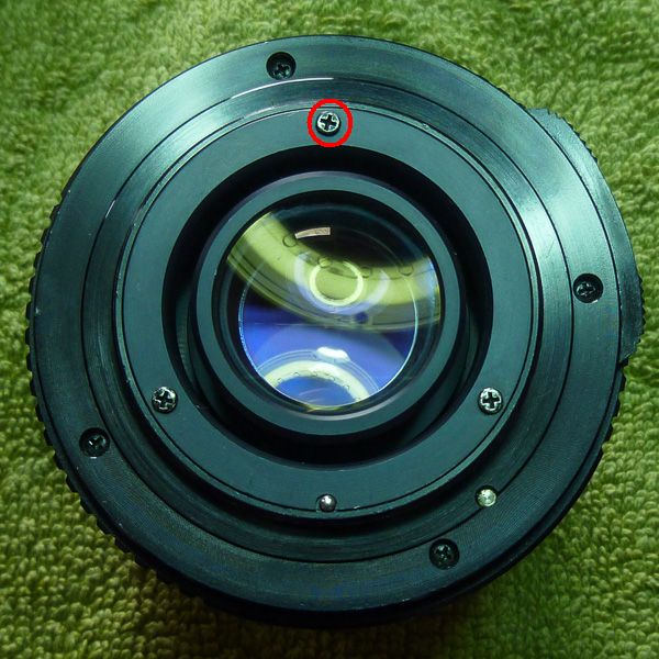 Der hintere Ring (auf dem M42-Gewinde) lässt sich mit 3 Schrauben lösen, um den hinteren Linsenblock raus zu schrauben. Dieser bleibt komplett zusammen. Nur die nach innen gerichtete Linse war beschlagen (Öldunst). Löst man die hintere Verschraubung des Blocks, lassen sich alle Linsen entnehmen.