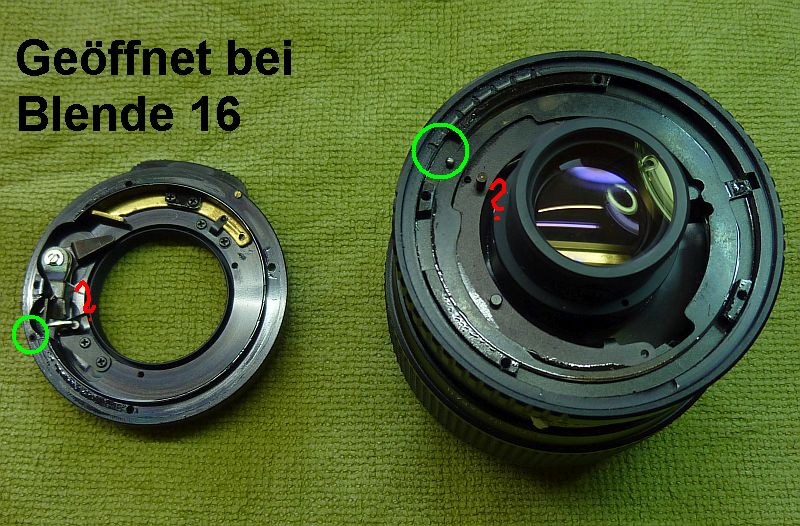 Die Kugel der Blendenrastung fällt in der Regel weg (grüner Kreis, Rastung für f16), auch die Feder im Deckel neigt zum Fliegen.
