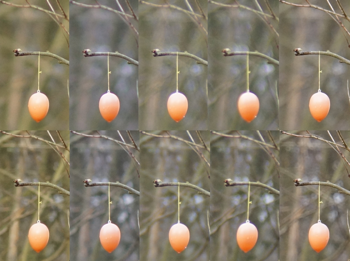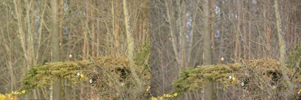 Als erstes Testobjekt habe ich Nachbars Ostereierbaum ausgewählt, Entfernung zum Aufnahmeort ca. 25 Meter. Kamera ist NEX-7 mit Stativ und Fernauslöser, stand versehentlich noch auf ISO 800 von gestern abend, aber das sollte schon ok sein.