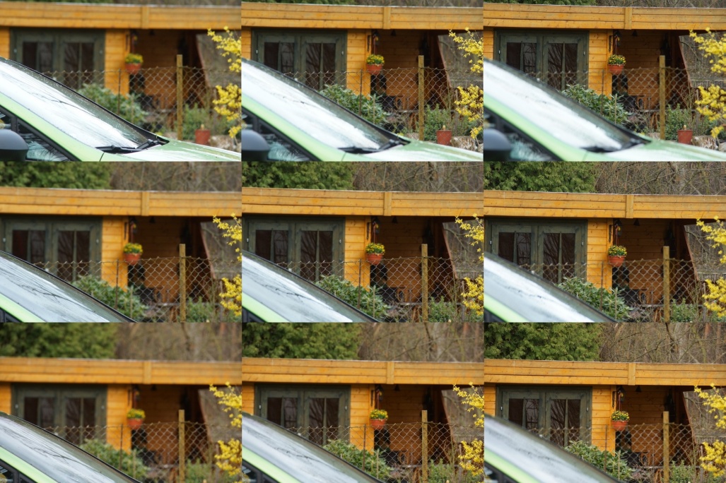 Zum Schluss noch ein Bildvergleich mit Vorder- , Mittel- und Hintergrundfokussierung. Der Fokus liegt jeweils auf der A-Säule, dem Moschendrahtzaun und der Blumenampel.