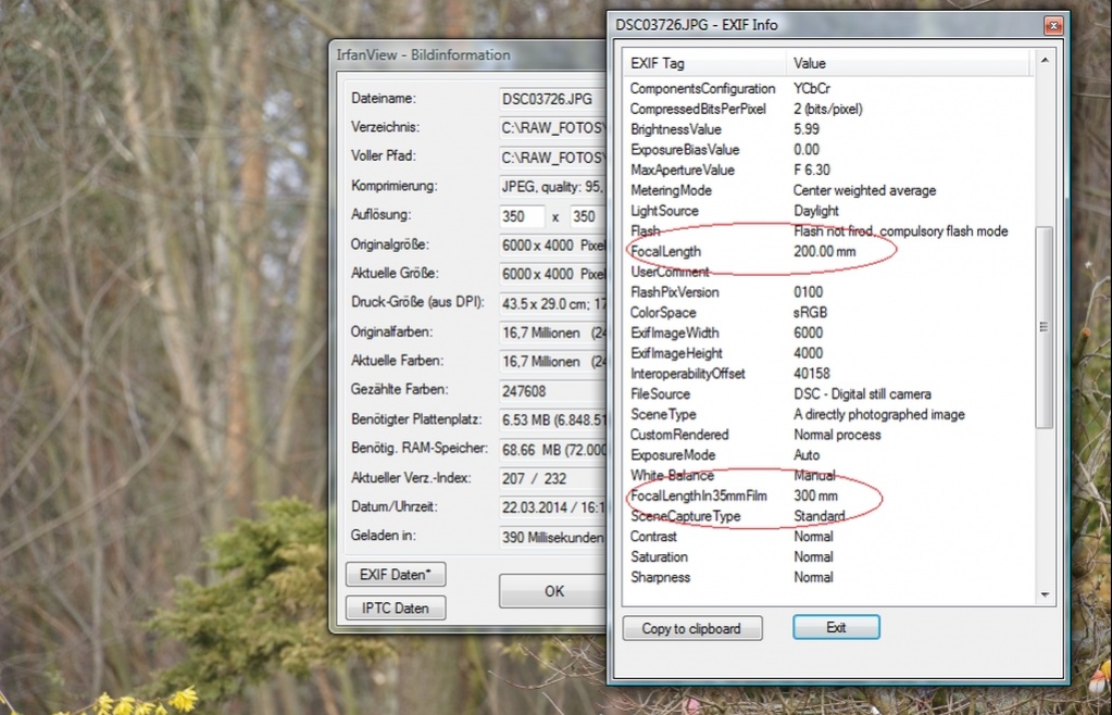 Denn wie die EXIF-Einträge des Sony zeigen, sollten die 200 mm APS-C einer KB-Brennweite von 300 mm entsprechen: