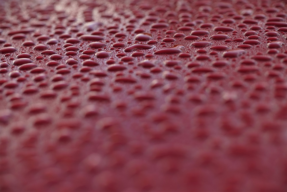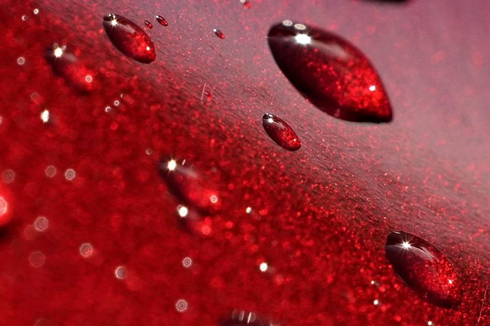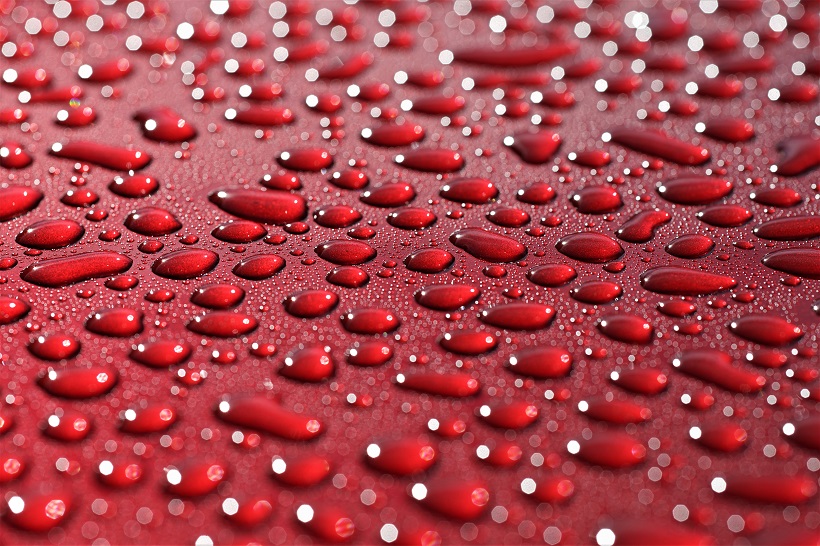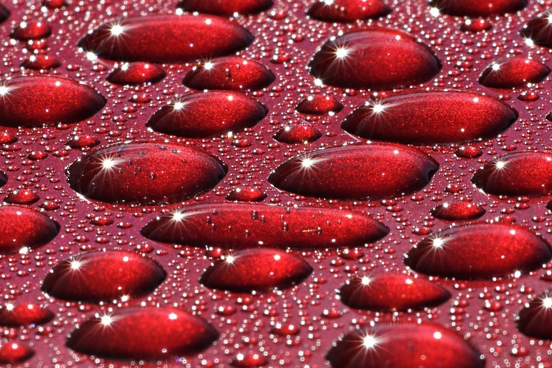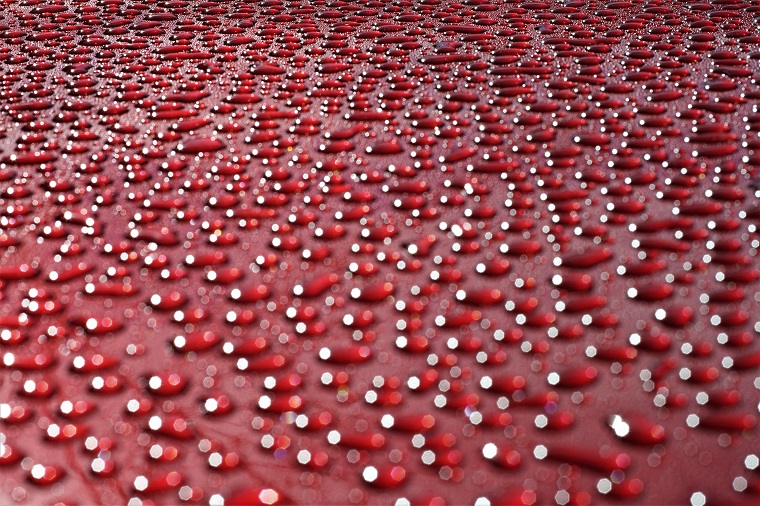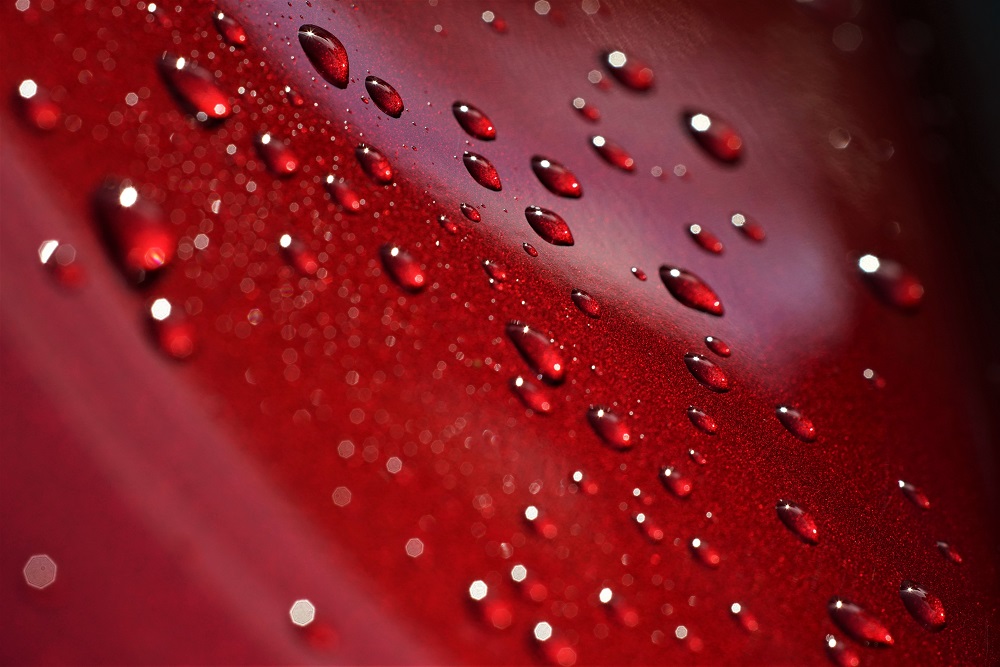 ein Metalliclack eines neuen Autos, übersäht mit Millionen von Tropfen ist eine tolle Spielwiese für die