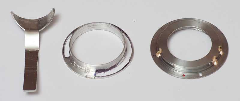 Links der Blendenhebel den ich immer noch selbst individuell anfertigen müßte. In der Mitte der Kupplungsring, rechts noch ein normaler M42-EF Adapter. Der wird als Universalteil noch etwas dicker, wegen des Auflagemaßes