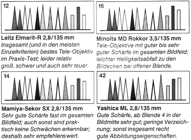 Wie weiter oben versprochen, hier noch die kurze Zusammenfassung aus dem großen 135er Test der Color Foto Heft 7/78. Insgesamt hat der Autor Walter E.Schön 43 135er getestet, verteilt auf vier Ausgaben der Color Foto. Leider besitze ich nur das Heft mit dem letzten Teil, aber damit immerhin die Zusammenfassung.