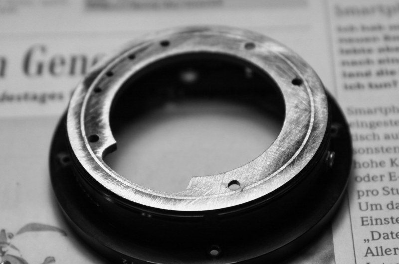 Kompliziert war an diesem Umbau, dass sich Blendenmechanik, Bajonett, Lichtdichtungsring und "Deckel" (jetzt EF-Bajonett) nur in einer Reihenfolge zusammen bauen lassen - als der "Deckel" noch ein einfaches, schmales Stück des Minolta-Bajonetts war, hat das damals natürlich kein Problem dargestellt.