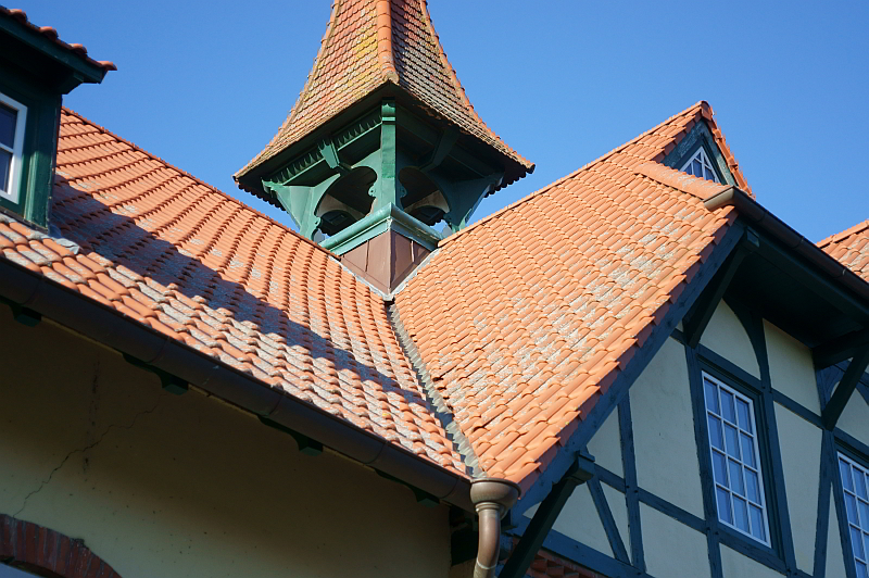 Und hier noch ein Bild, bei dem auf den Kreuzungspunkt der Dachvorderkante des Glockenturmes am Übergang zum grünen Holz scharf gestellt wurde..