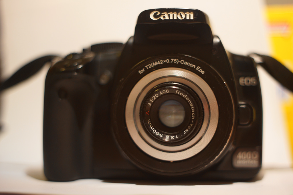 Der Tubus ermöglicht es, ein Rodenstock Ysar 3.5/50mm und ein Meyer Optik Diaplan 4.5/55mm über einen T2 auf Canon EF Adapter mithilfe des VNEX M39 Inlay Rings an DSLR Kameras zu betreiben.