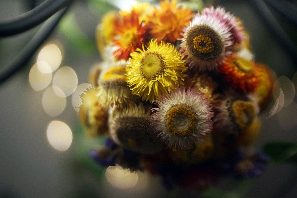 Kurz vor Nahbereichsendanschlag bei etwa 30-40 cm vom Trockenstrauß entfernt mit Lichterkette ca. 2,5 Meter entfernt im Hintergrund