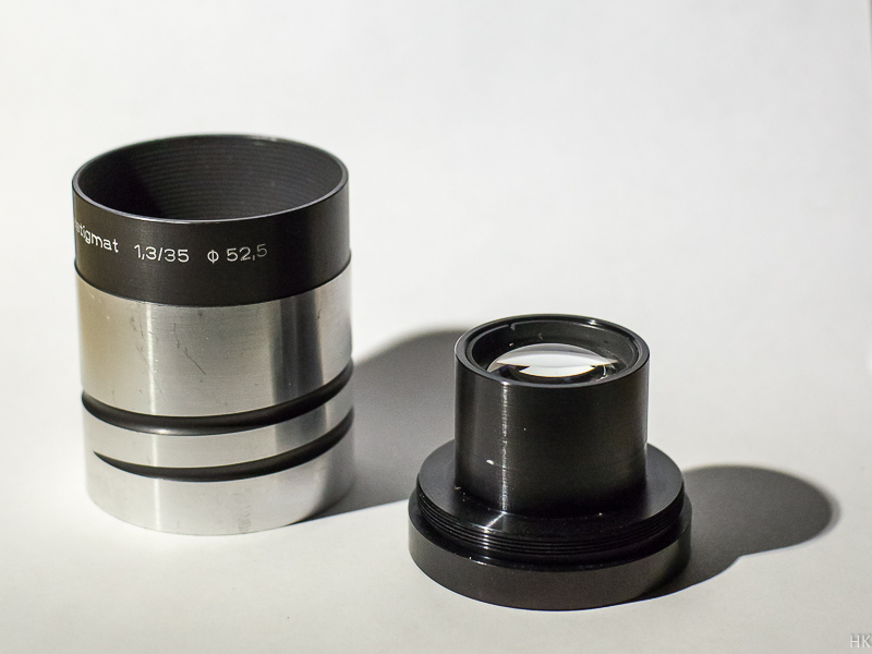Ich habe jetzt jemanden gefunden, der mir auf einer Drehbank den mehr oder weniger nutzlosen "Kragen" samt Gewinde von dem eigentlichen Tubus abdrehen konnte. Übrig bleibt zunächst einmal ein geradezu lächerlich winziges Restobjektiv von 35 mm Außendurchmesser und ca. 36,5 mm Länge. Man schaue sich mal sonstige 1.4/35mm-Objektive im Vergleich dazu an...